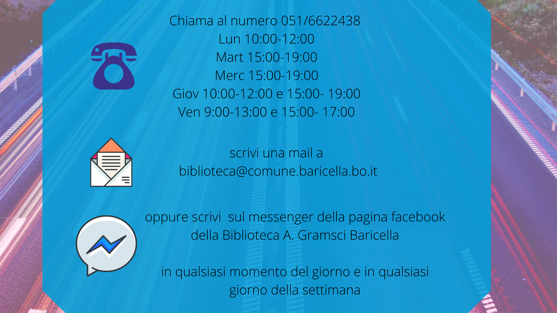 Mail: biblioteca@comune.baricella.bo.it (siamo a disposizione 7 giorni su 7 e a tutte le ore, un incaricato risponderà nel più breve tempo possibile)