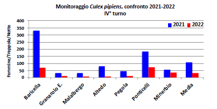 Il dato di questa settimana indica una generale diminuzione delle catture di Culex pipiens, ora su valori molto bassi anche a causa della pioggia che ha caratterizzato la nottata del rilevamento. Si segnalano catture della zanzara alluvionale, Aedes caspius, nelle stazioni di Altedo e Ponticelli.