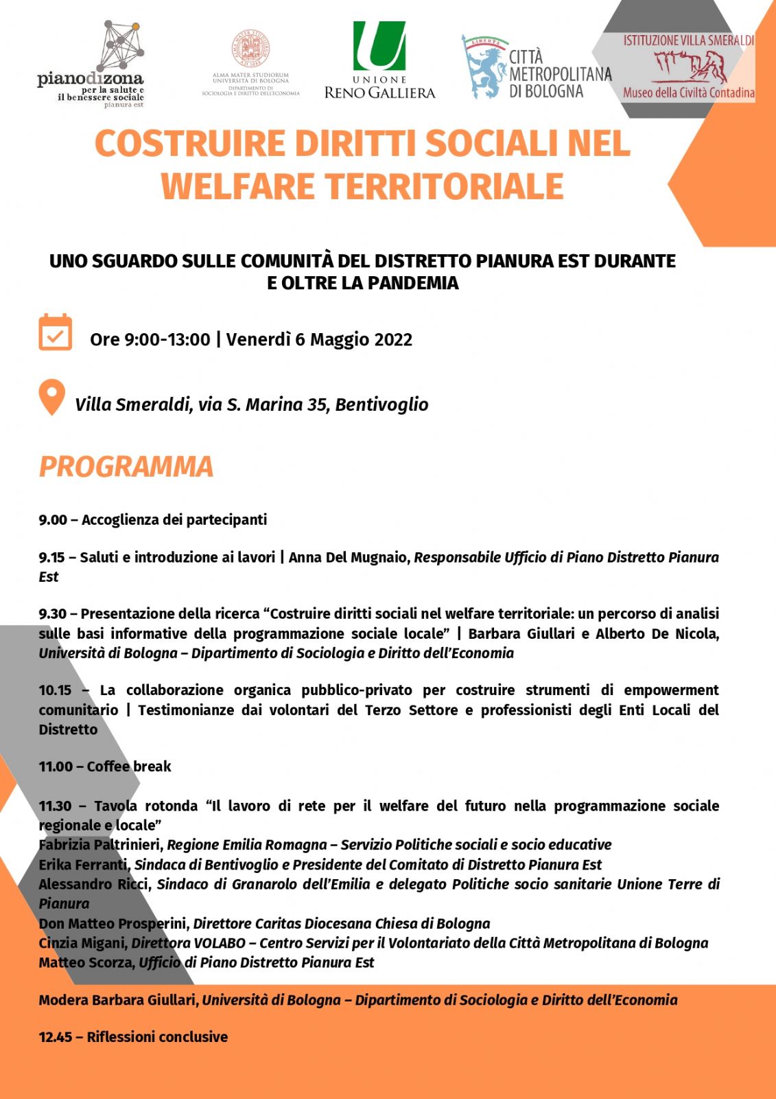 Partendo dalla presentazione della ricerca “Costruire diritti sociali nel welfare territoriale”, condotta dal Dipartimento di Sociologia e Diritto dell’Economia dell’Università di Bologna in collaborazione con l'Ufficio di Piano del Distretto Pianura Est, la giornata rappresenterà l'occasione per condividere pratiche e modalità di lavoro di rete intraprese per contrastare le diverse forme di povertà nel periodo pandemico da parte degli Enti Locali del Distretto, in raccordo con gli Enti di Terzo Settore, con le testimonianze dirette dei diversi attori.