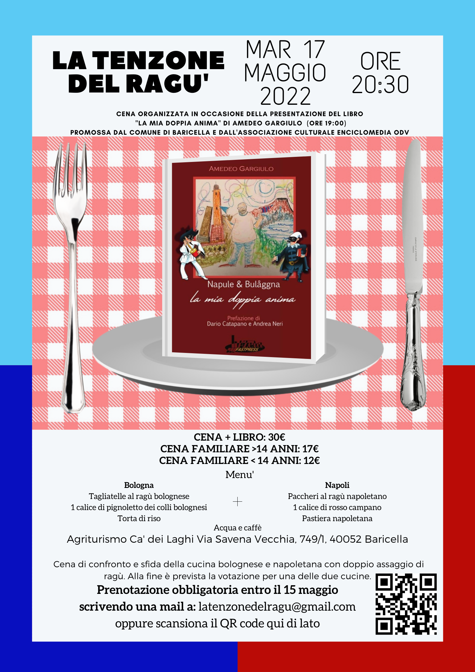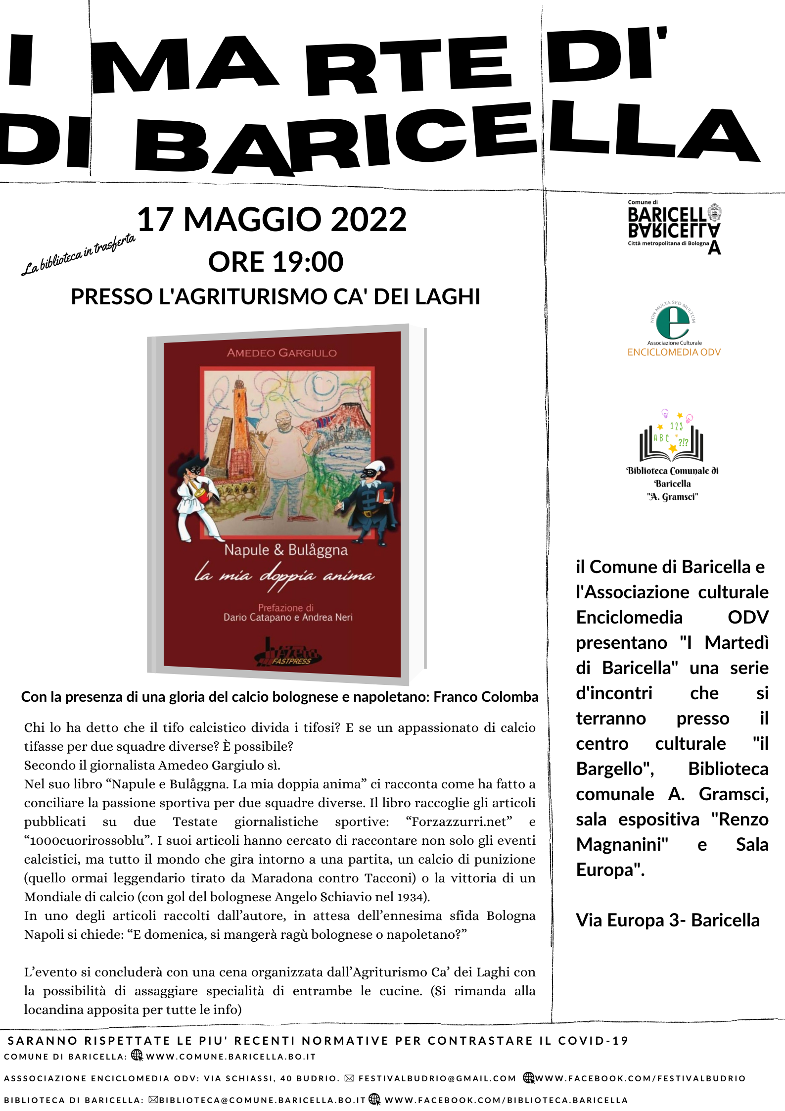 Per questo evento in cui sarà presentato il libro di Amedeo Gargiulo dal titolo "Napule e Bulåggna. La mia doppia anima" si è pensato di "portare la biblioteca in trasferta" presso l'Agriturismo Ca' dei Laghi poichè in uno degli articoli raccolti dall’ autore, in attesa dell’ennesima sfida Bologna Napoli si chiede: “E domenica, si mangerà ragù bolognese o napoletano?”. L’evento si concluderà con una cena, , con prenotazione obbligatoria entro il 15 maggio, "La tenzone del ragù" organizzata dall’ Agriturismo Ca’ dei Laghi con la possibilità di assaggiare specialità di entrambe le cucine. (Si rimanda alla locandina apposita, in calce, per tutte le info e per prenotazioni).