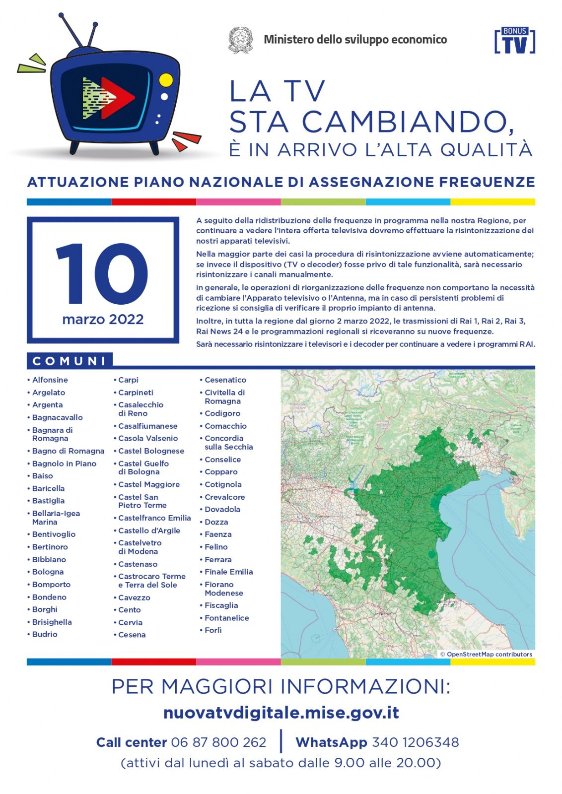 Inoltre, in tutta la regione dal giorno 2 marzo 2022, le trasmissioni di Rai 1, Rai 2, Rai 3, Rai News 24 e le programmazioni regionali si riceveranno su nuove frequenze. Sarà necessario risintonizzare i televisori e i decoder per continuare a vedere i programmi RAI.