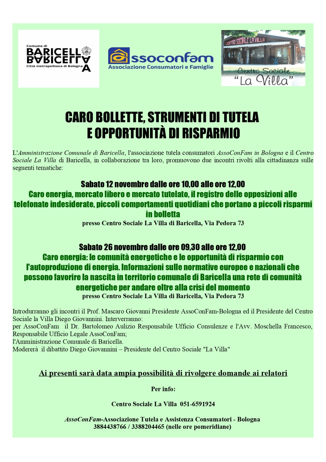 L'Amministrazione Comunale di Baricella, in collaborazione con l'associazione tutela consumatori AssoConFam di Bologna e il Centro Sociale La Villa di Baricella, promuove due incontri rivolti alla cittadinanza sulle seguenti tematiche: