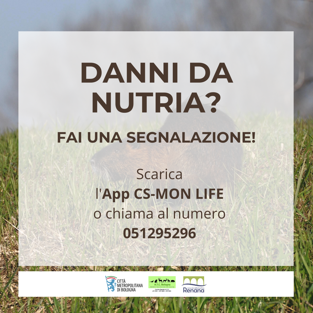Come? Segnala la presenza di nutrie. Puoi farlo attraverso la nuova App CSMON-LIFE scaricabile a questo link! oppure con una semplice telefonata al 051295296.