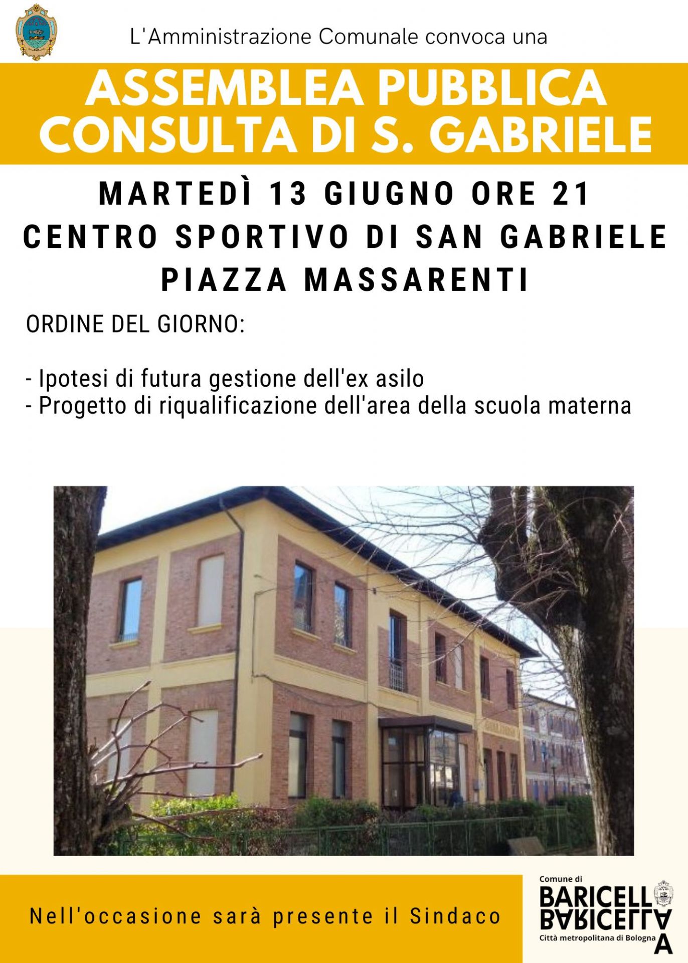 Si informa che l'Amministrazione Comunale ha convocato un'assemblea pubblica della Consulta di frazione di San Gabriele per il giorno martedì 13 giugno alle ore 21 presso il centro sportivo di San Gabriele (piazza Massarenti).