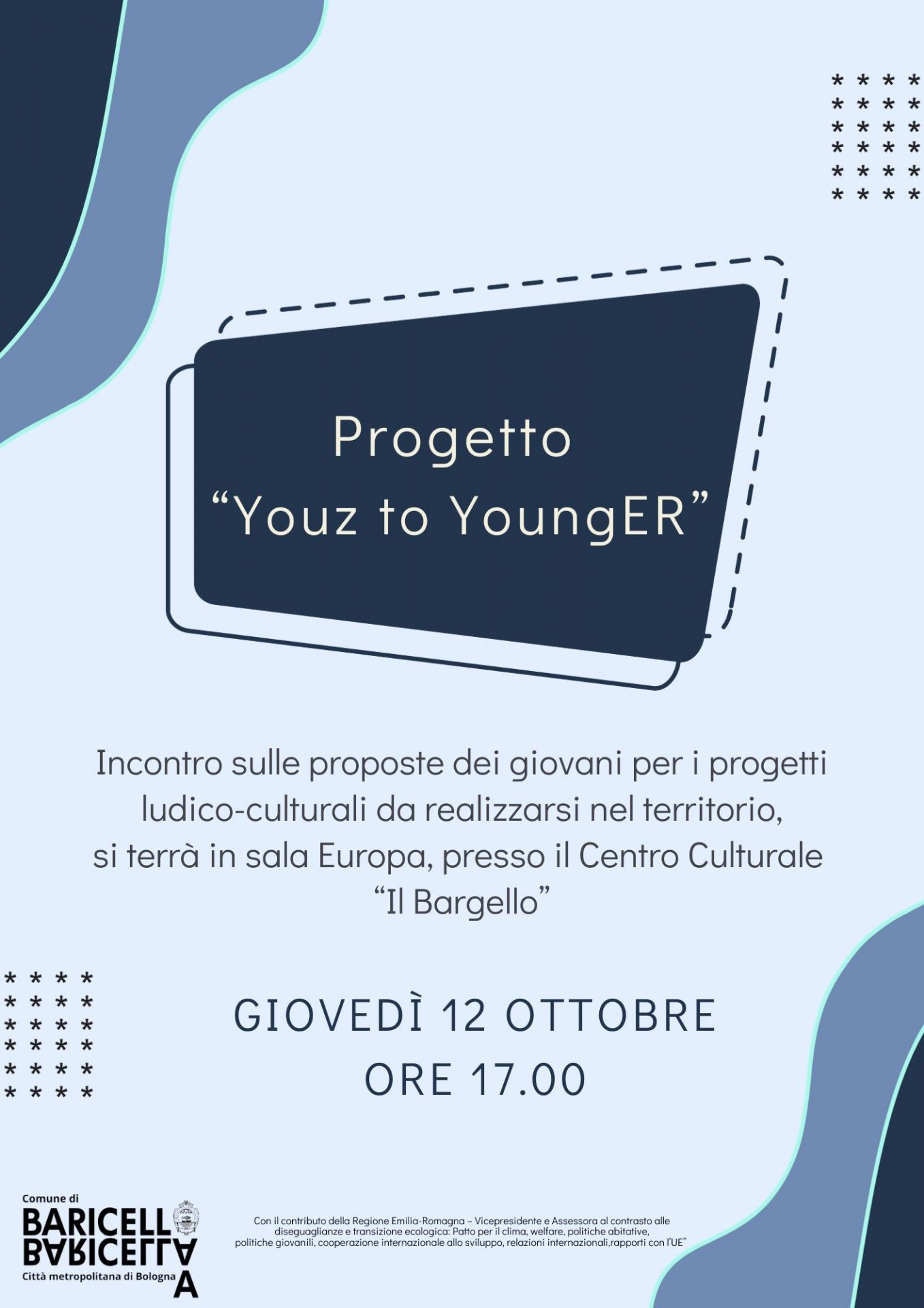 Invitiamo i giovani con fascia d'età compresa tra i 15 e i 35 anni a partecipare all'incontro previsto Giovedì 12 Ottobre 2023 alle 17:00 per ascoltare i giovani per progetti culturali da realizzarsi nel territorio.