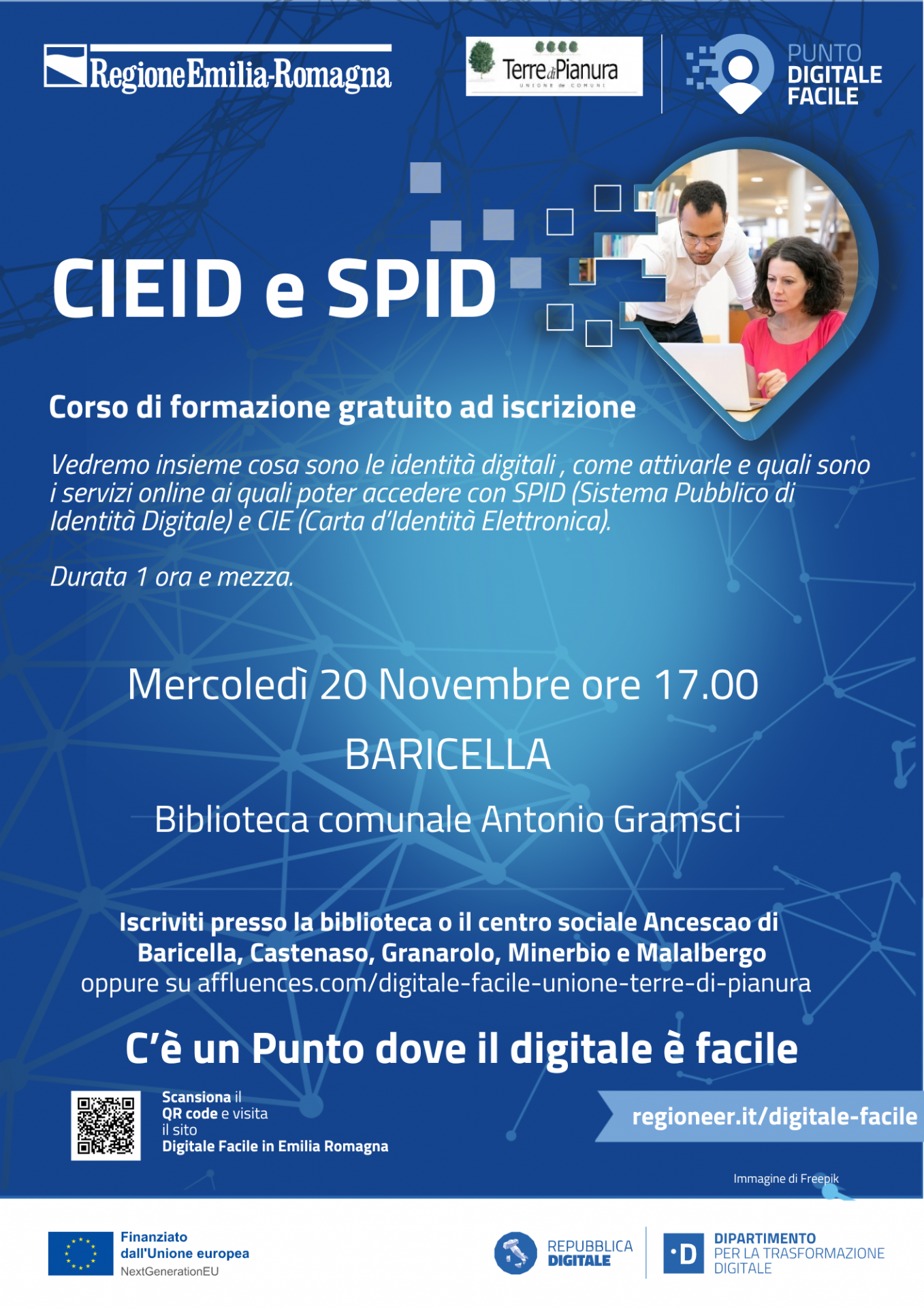 Vuoi imparare a usare SPID e CIE per accedere ai servizi digitali? Partecipa anche tu al Corso Gratuito di Formazione dedicato che si terrà Mercoledì 20 novembre alle ore 17:00, presso la Biblioteca A. Gramsci di Baricella.