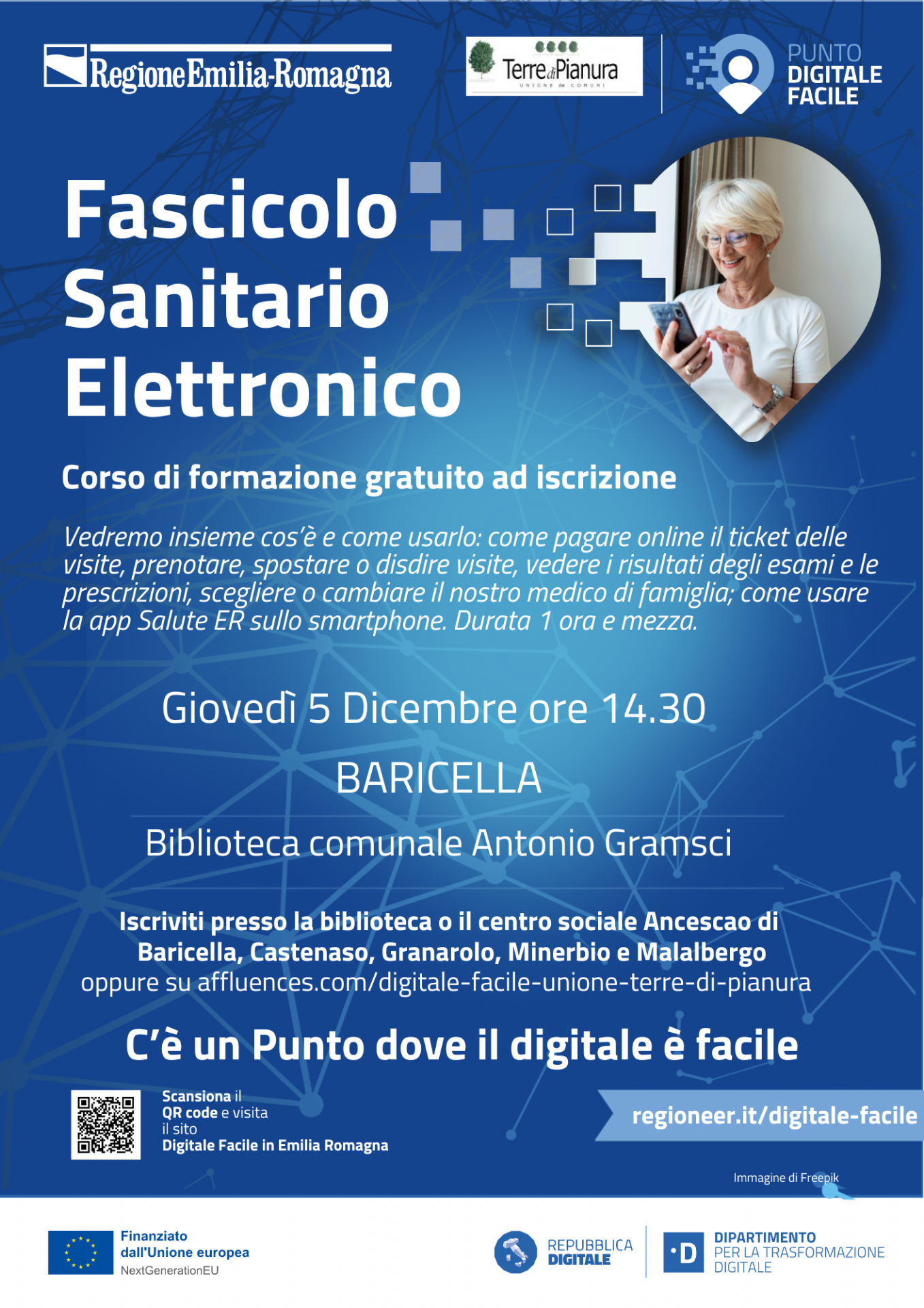 Vuoi imparare a utilizzare il Fascicolo Sanitario Elettronico (FSE) e accedere ai tuoi dati sanitari online? Partecipa anche tu al Corso Gratuito di Formazione dedicato che si terrà giovedì 5 dicembre alle ore 14:30, presso la Biblioteca A. Gramsci di Baricella.
