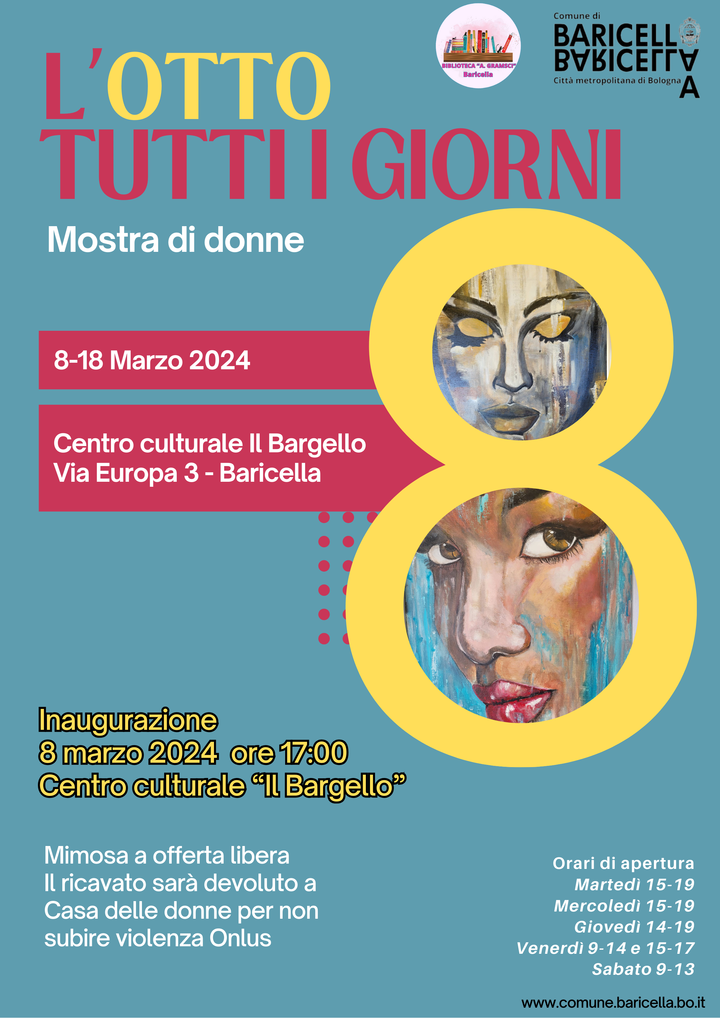Nell'ambito della rassegna di eventi organizzata dal Comune di Baricella in onore della Giornata Internazionale della Donna, siamo lieti di presentarvi un'anteprima esclusiva con l'artista Monica Zanasi. L'inaugurazione della sua mostra "L’otto tutti i giorni: mostra di donne" avrà luogo venerdì 8 marzo alle ore 17:00 presso il Centro Culturale il Bargello.