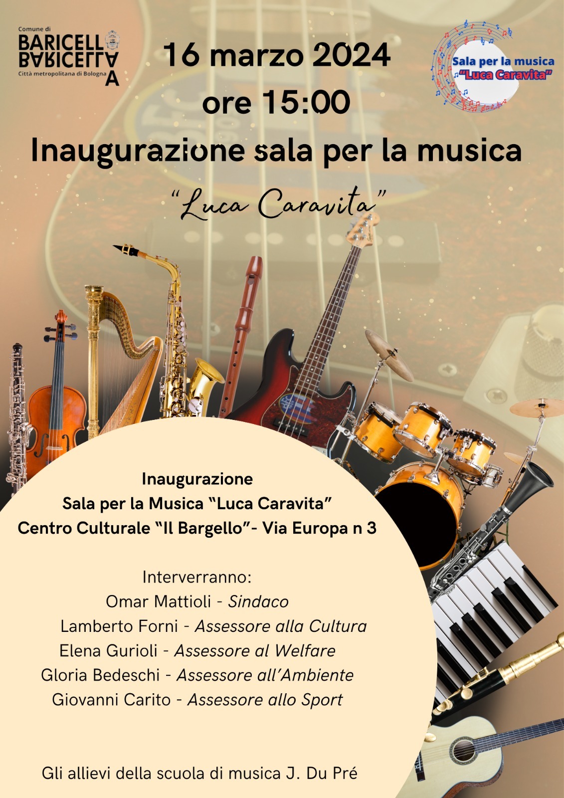 • Alle ore 15.00 verrà inaugurata la Sala per la Musica nel nome ed in ricordo della passione musicale di Luca Caravita, l’operaio saccarifero residente a Baricella deceduto in seguito a un incidente sul lavoro.