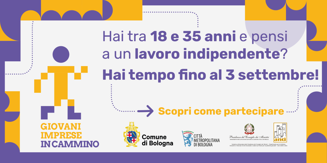 Si informa che c'è tempo fino alle ore 12:00 di martedì 3 Settembre per partecipare al progetto “Giovani imprese in cammino", finalizzato a fornire supporto all'imprenditorialità giovanile nell’area delle Unioni Appennino bolognese, Savena-Idice e Reno-Lavino-Samoggia.
