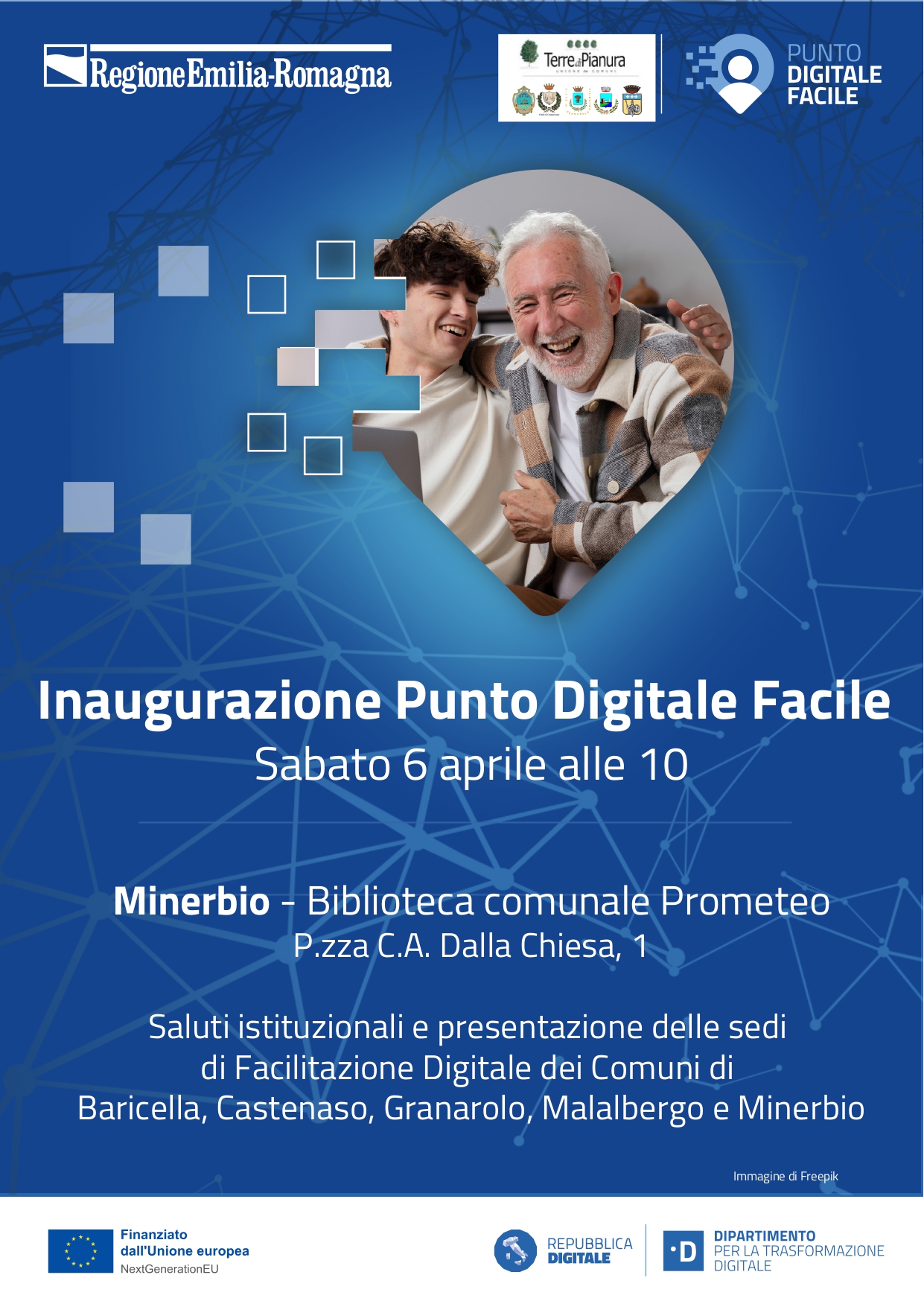 Sabato 6 aprile alle ore 10.00 presso la Biblioteca comunale di Minerbio siete tutti invitati all'Inaugurazione del progetto Digitale Facile dell'Unione Terre di Pianura, in cui saranno presentate tra le varie sedi di Facilitazione Digitale anche quelle riferite al Comune di Baricella.