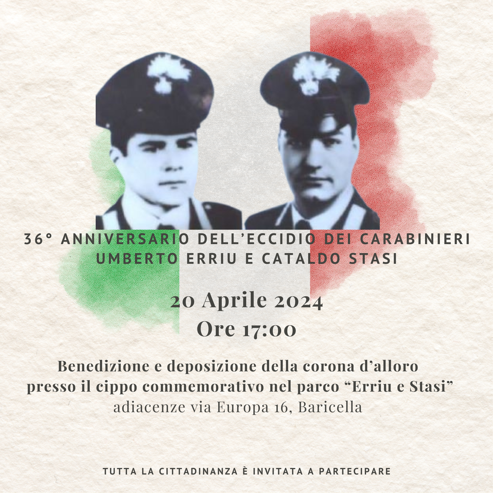 In occasione del XXXVI Anniversario dell'eccidio dei Carabinieri Umberto Erriu e Cataldo Stasi, la cittadinanza è invitata a partecipare alla cerimonia commemorativa che si terrà sabato 20 aprile alle ore 17.00 a Baricella presso il parco "Erriu e Stasi"