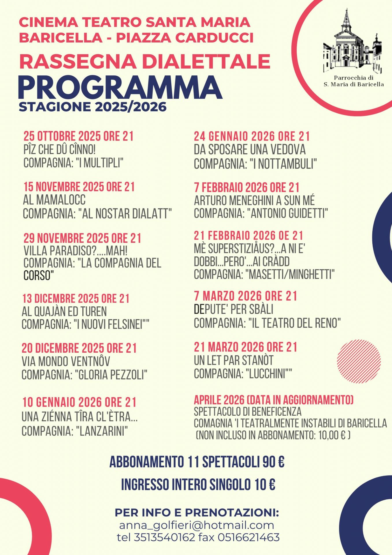 È possibile acquistare i biglietti anche nei giorni che precedono lo spettacolo presso la segreteria parrocchiale in Piazza Carducci n. 8 (Baricella) il giovedì e il venerdì nei seguenti orari: 10:00-12:00 e 15:00-18:00