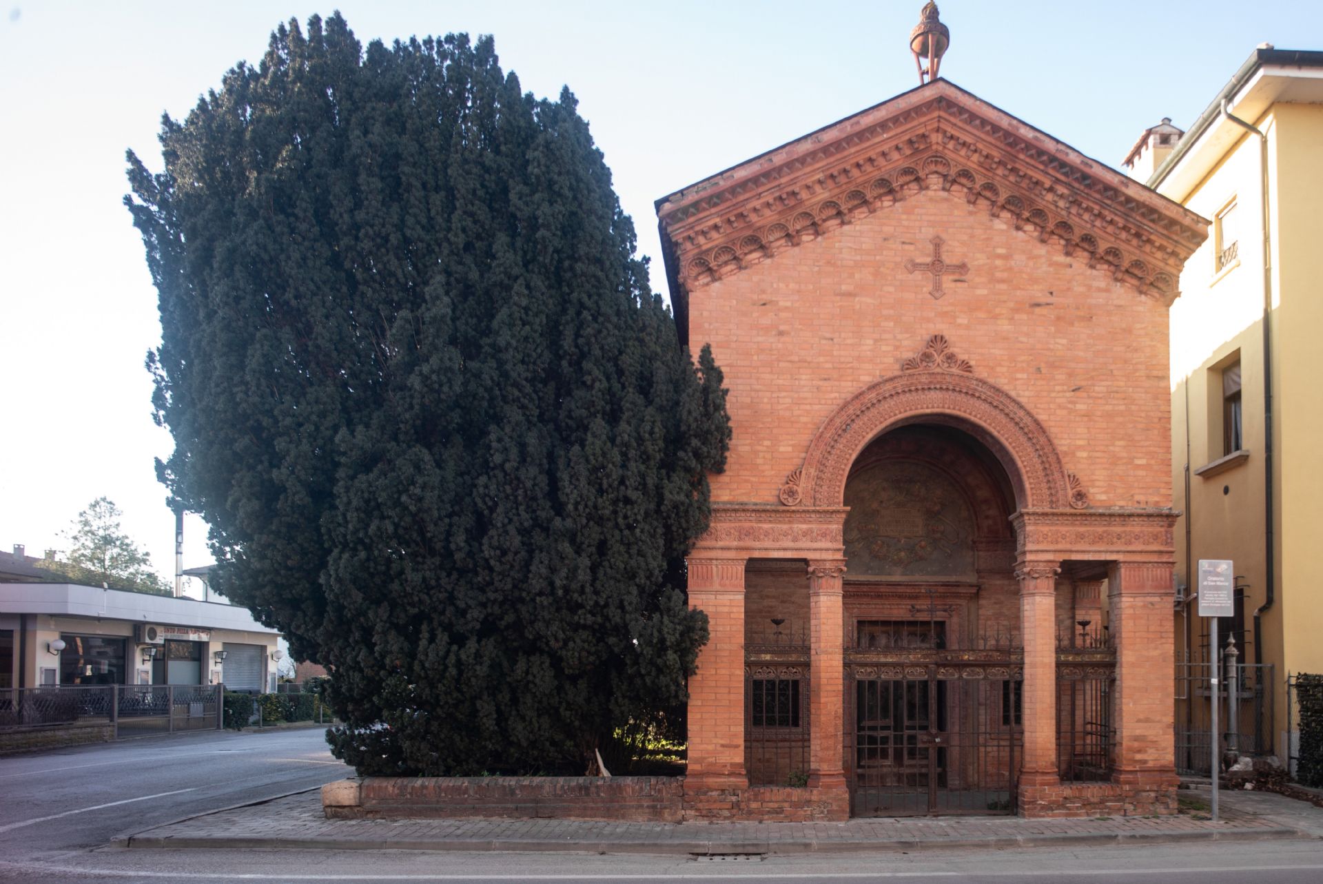 La cappella funeraria di Enrico Zucchini è un rilevante esempio di arte funeraria in stile floreale del gruppo di artisti e artigiani bolognesi capeggiato dall'architetto Alfonso Rubbiani, di cui sono caratteristiche la decorazione floreale delle pareti e quella scultorea del cippo e dell'urna cineraria, il cancello in ferro battuto, il portale d'ingresso e l'inginocchiatoio in legno intarsiato. L'edificio fu realizzato nel 1905 e interamente decorato con affreschi celebrativi della figura del Cavalier Zucchini, ad opera del pittore Giuseppe De Col.