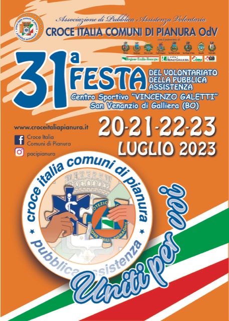 Con il patrocinio del Comune di Baricella, da Giovedì 20 Luglio a Domenica 23 Luglio 2023 si terrà la 31° Festa del Volontariato presso il centro sportivo "Vincenzo Galetti" in Via San Venanzio di Galliera, organizzata dai volontari della P.A Croce Italia Comuni di Pianura.