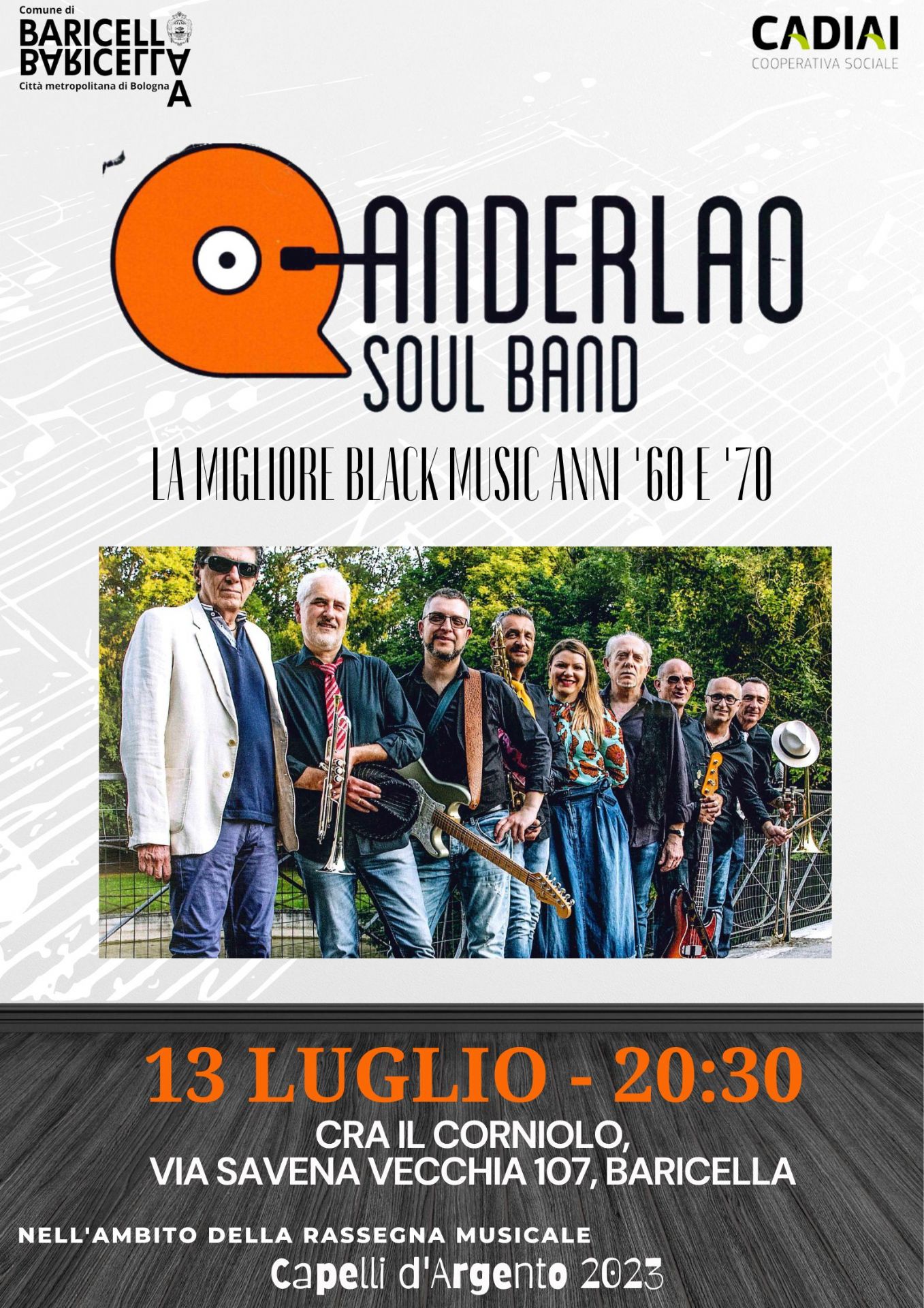 Nell'ambito della 25° edizione della Rassegna musicale "Capelli d'Argento" Giovedì 13 Luglio alle 20:30 vi aspettiamo presso la residenza per anziani "Il Corniolo" in Via Savena Vecchia 107, dove si terrà il concerto dell'ANDERLAO BAND, un gruppo composto da nove brillanti elementi, uniti dalla passione per la musica soul e r&b, che propone pezzi tra i più gettonatati e rappresentativi della black music degli anni ‘60 e ’70.