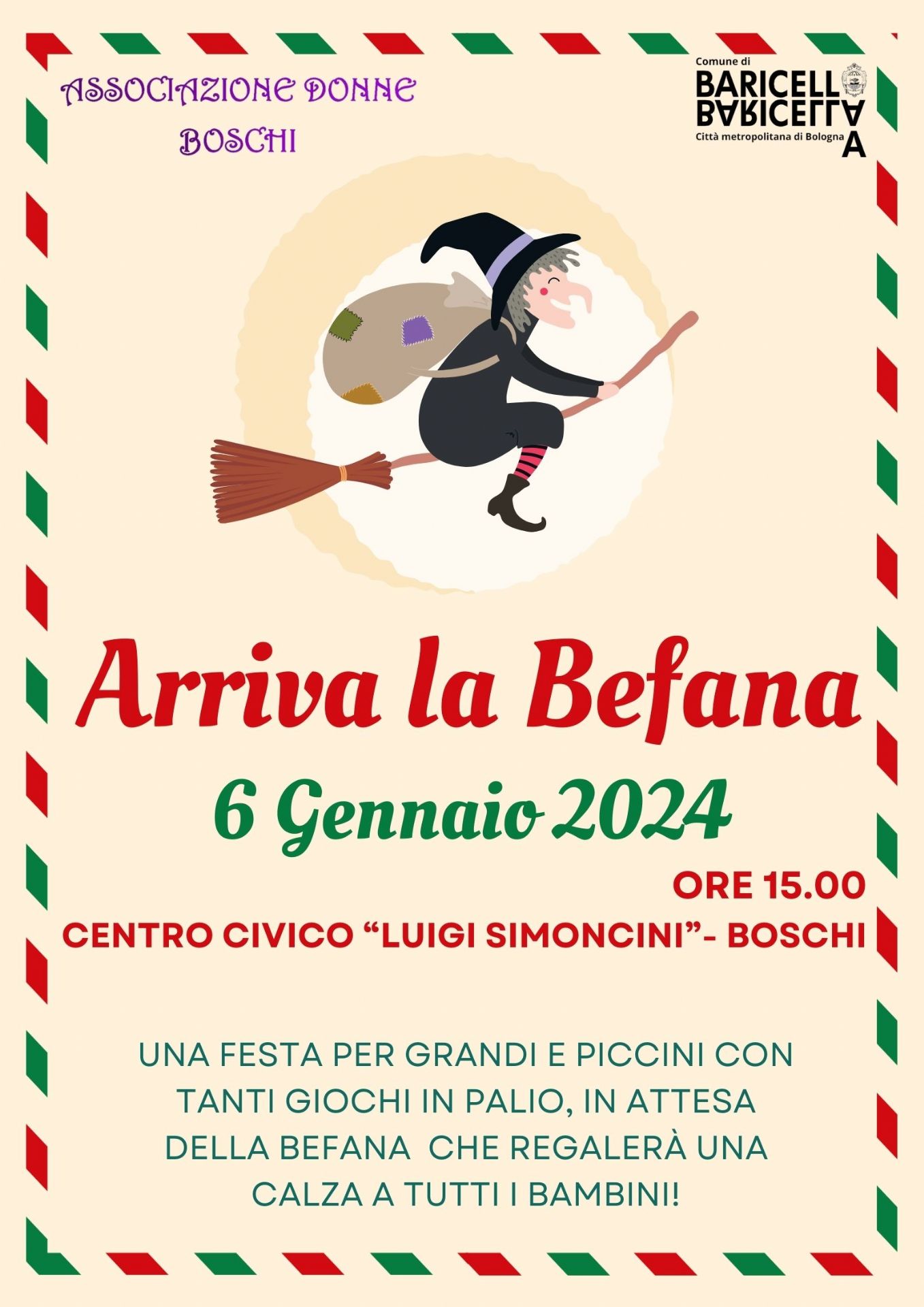 Anche quest'anno Sabato 6 Dicembre arriva la befana a Boschi con una calza in regalo per tutti i bambini.