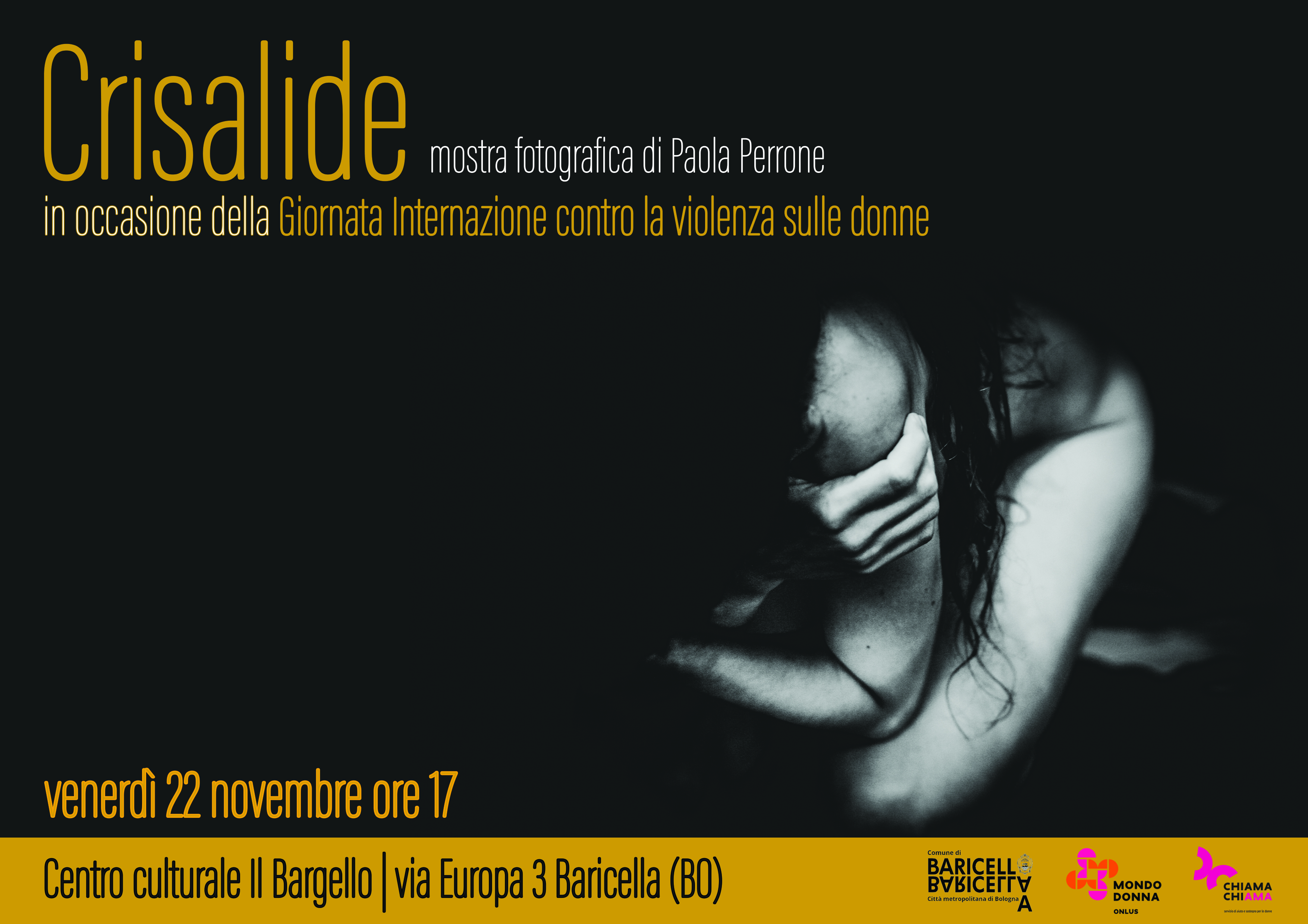 - Inaugurazione della mostra fotografica “Crisalide”: la fotografa Paola Perrone presenta il suo progetto artistico, accompagnata dalle note di Enza Alejandra Prestia che si esibisce nello spettacolo musicale “Lunatica” di propria autorìa, un viaggio unico nel mondo della determinazione e primordialità tipici del femminile. La mostra, come si evince già dal simbolico titolo "Crisalide", esplora il processo di trasformazione e rinascita di una donna sopravvissuta alla violenza di genere.