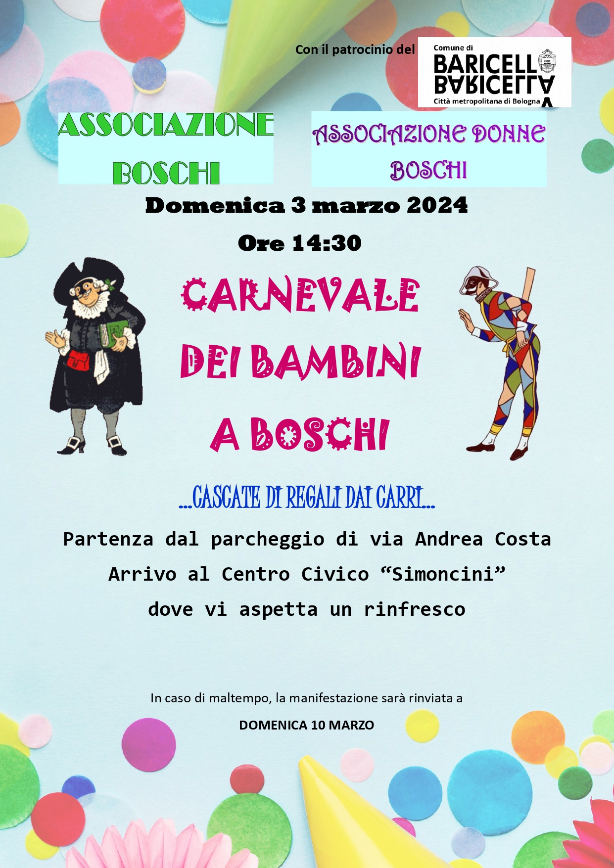 Domenica 3 Marzo 2024 torna a Boschi il tradizionale Carnevale dei bambini che coinvolge tutta la popolazione con i festeggiamenti carnascialeschi, la sfilata di carri e le cascate di regali!