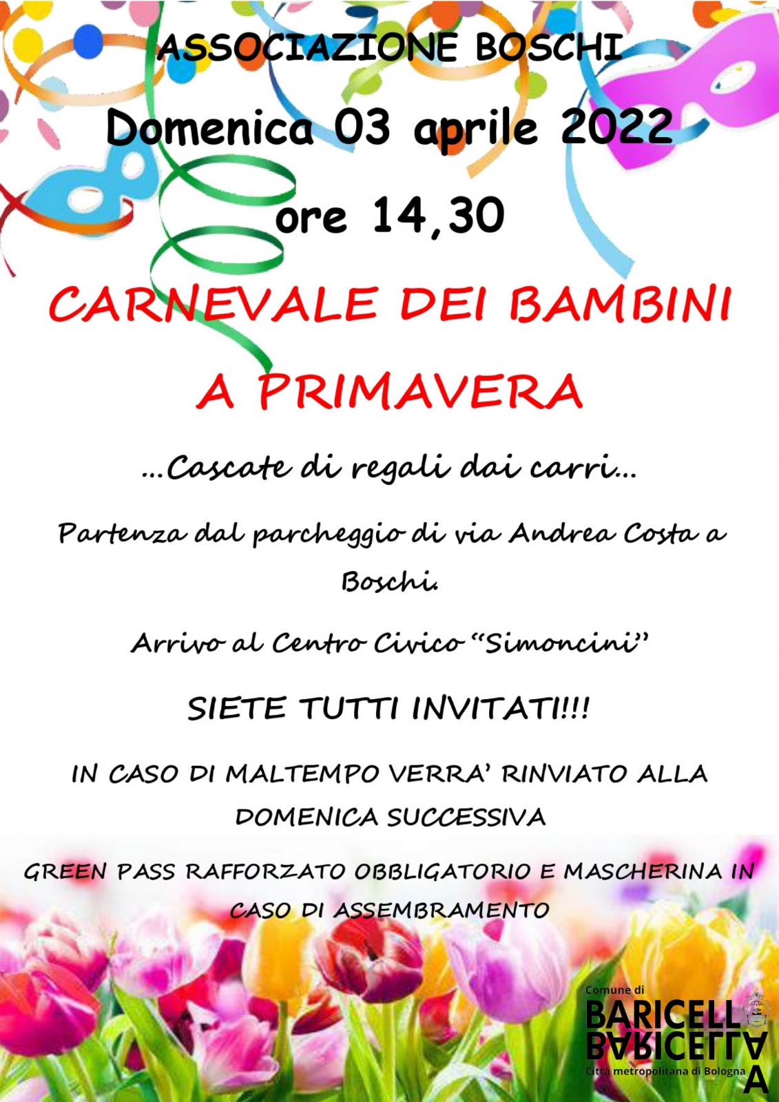 A Boschi di Baricella Domenica 3 Aprile 2022 torna a svolgersi, per la prima volta dall’inizio dell’emergenza sanitaria che ha colpito il nostro paese, il tradizionale “Carnevale dei bambini” che coinvolge tutta la popolazione nei tradizionali e consueti festeggiamenti carnascialeschi, con le cascate di regali dai carri!