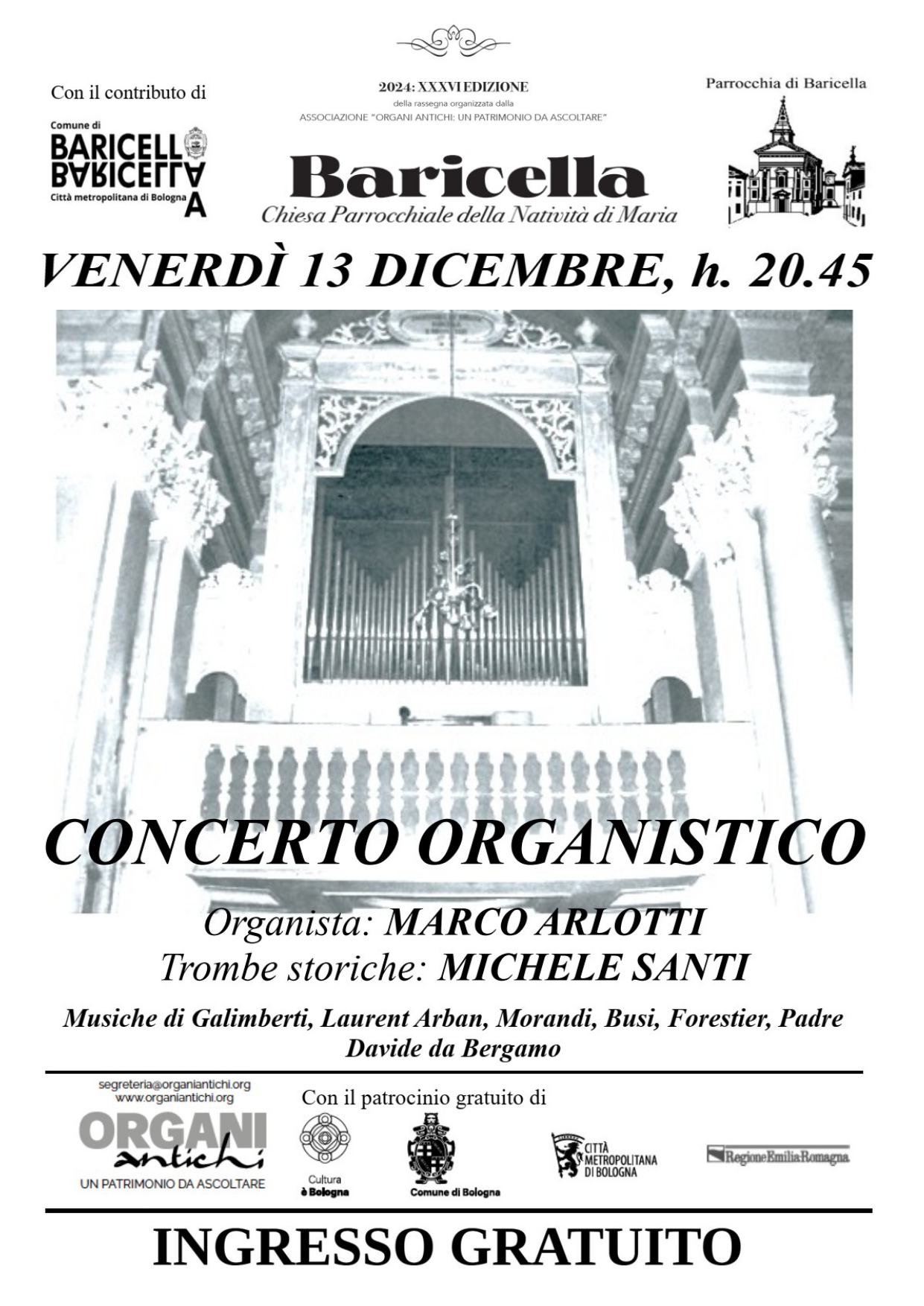 Torna anche quest'anno a Baricella il tradizionale concerto di organo nell'ambito della Rassegna di Organi Antichi: un patrimonio da ascoltare. A far suonare l'organo della nostra chiesa, costruito nel 1874 da Adeodato Bossi Urbani, sarà l'organista Marco Arlotti accompagnato dalle trombe storiche di Michele Santi.