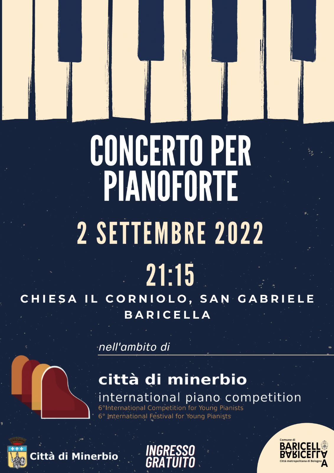 Nell'ambito della sesta edizione del Concorso Pianistico internazionale "Città di Minerbio", realizzato anche con il contributo del Comune di Baricella, vi aspettiamo Venerdì 2 Settembre alle 21:15 presso la Chiesa del Corniolo di San Gabriele a Baricella per un Concerto per Pianoforte.