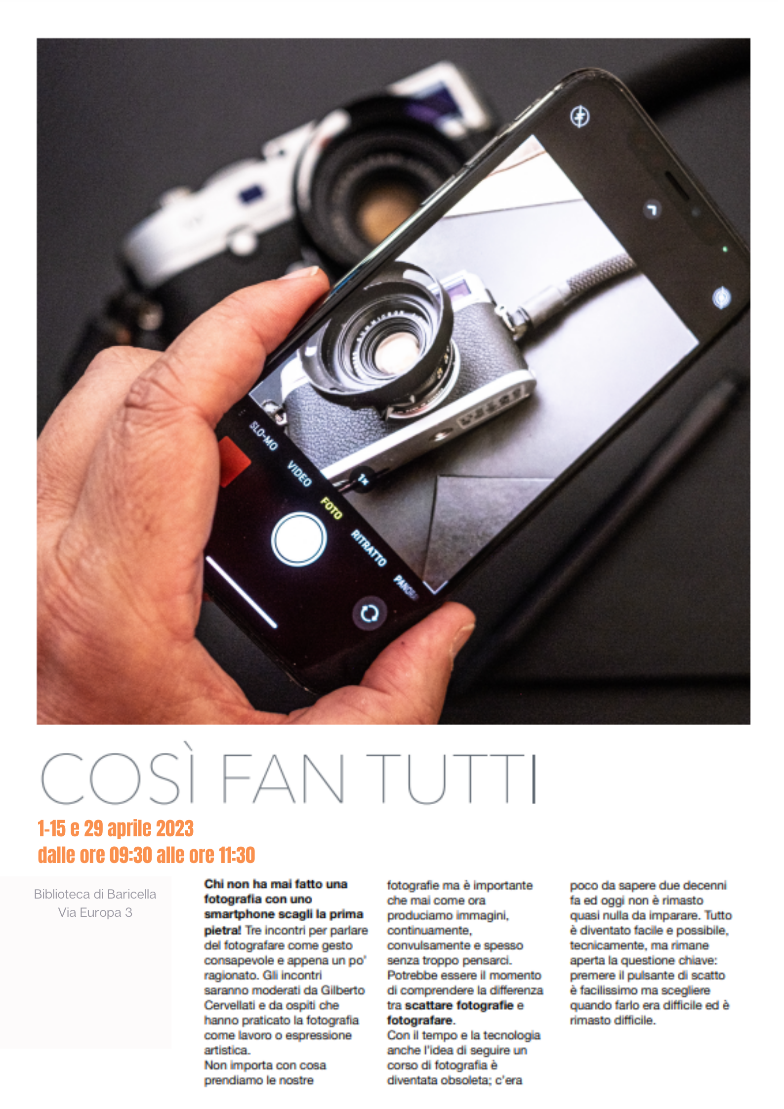 Il corso, a cura di Gilberto Cervellati (giornalista, direttore de "il Municipio di Baricella" e fotografo esperto), parte dall’assunto che, grazie all’avvento degli smartphone, ognuno di noi ha uno strumento fotografico nelle proprie tasche.