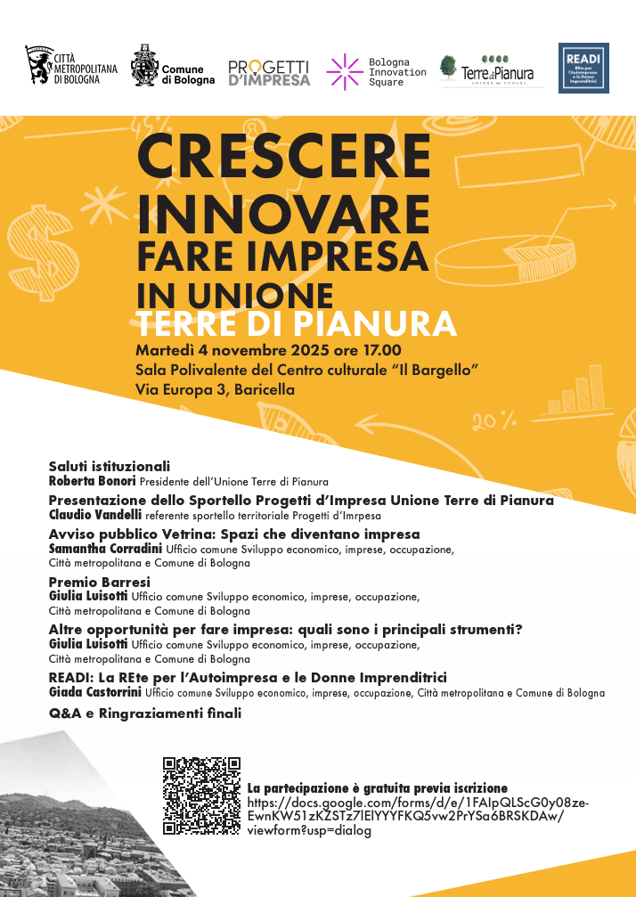 Lo sportello Progetti d’Impresa dell'Unione Terre di Pianura, in collaborazione con l’Ufficio comune Sviluppo economico, imprese e occupazione di Città metropolitana e Comune di Bologna, organizza martedì 4 novembre, a partire dalle ore 17.00, presso la Sala Europa del Centro culturale “Il Bargello” (via Europa 3, Baricella), l’evento "FARE IMPRESA in Unione Terre di Pianura", dedicato alla diffusione e promozione dei servizi e degli strumenti di pianificazione per chi desidera avviare una attività imprenditoriale.