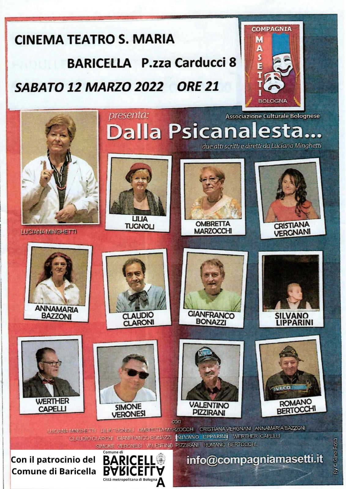 Nell'ambito della Stagione teatrale dialettale al Teatro Santa Maria di Baricella e della rassegna "Otto Marzo: femminile plurale" dedicata alla Giornata internazionale della donna, Sabato 12 Marzo 2022 alle 21:00 va in scena, con il patrocinio del Comune di Baricella, la commedia tutta in salsa bolognese "Dalla Psicanalesta" della Compagnia Marco Masetti.