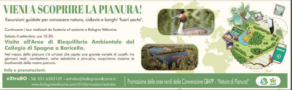 Il 4 settembre 2021 alle ore 10:30 ci sarà un evento da non perdere che si svolgerà nel nostro Comune e più precisamente nell'Area di riequilibrio ambientale del collegio di Spagna a Baricella. Un tour di Sustenia srl organizzato assieme a Bologna welcome che rientra nel progetto "Vieni a scoprire la natura!" escursioni guidate per conoscere natura, ciclovie e borghi "fuori porta". Per prenotare l'escursione, che sarà a pagamento, visita il sito https://www.bolognawelcome.com/it
