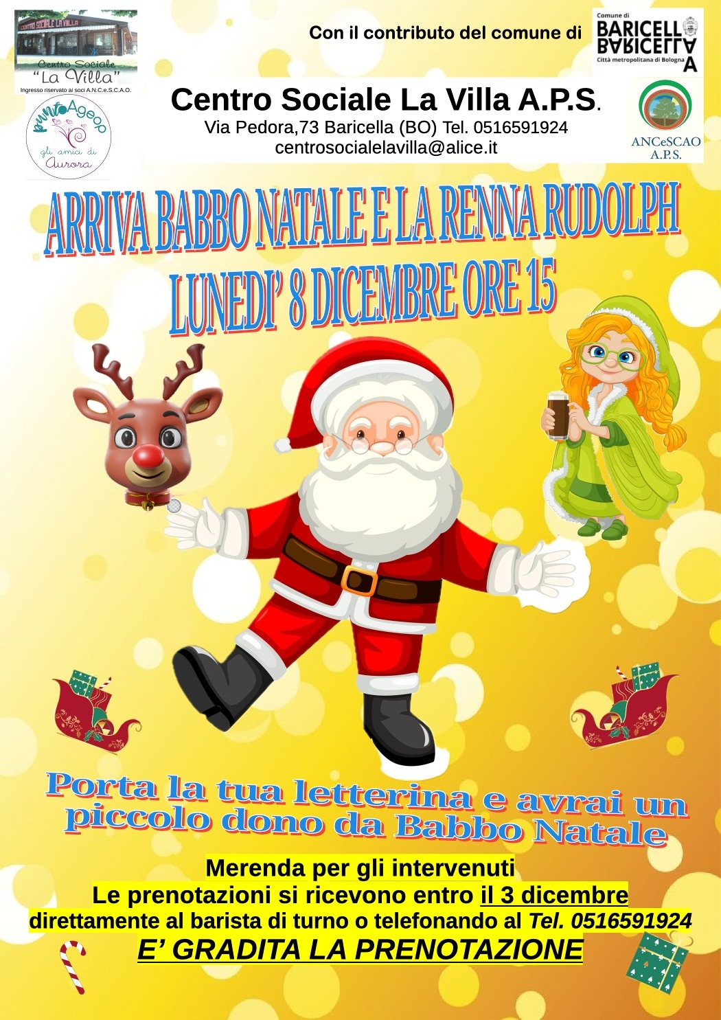 Famiglie e bambini sono invitati a partecipare al pomeriggio speciale in programma lunedì 8 dicembre, alle ore 15.00, presso il Centro Sociale “La Villa”, dove saranno presenti Babbo Natale e la renna Rudolph!