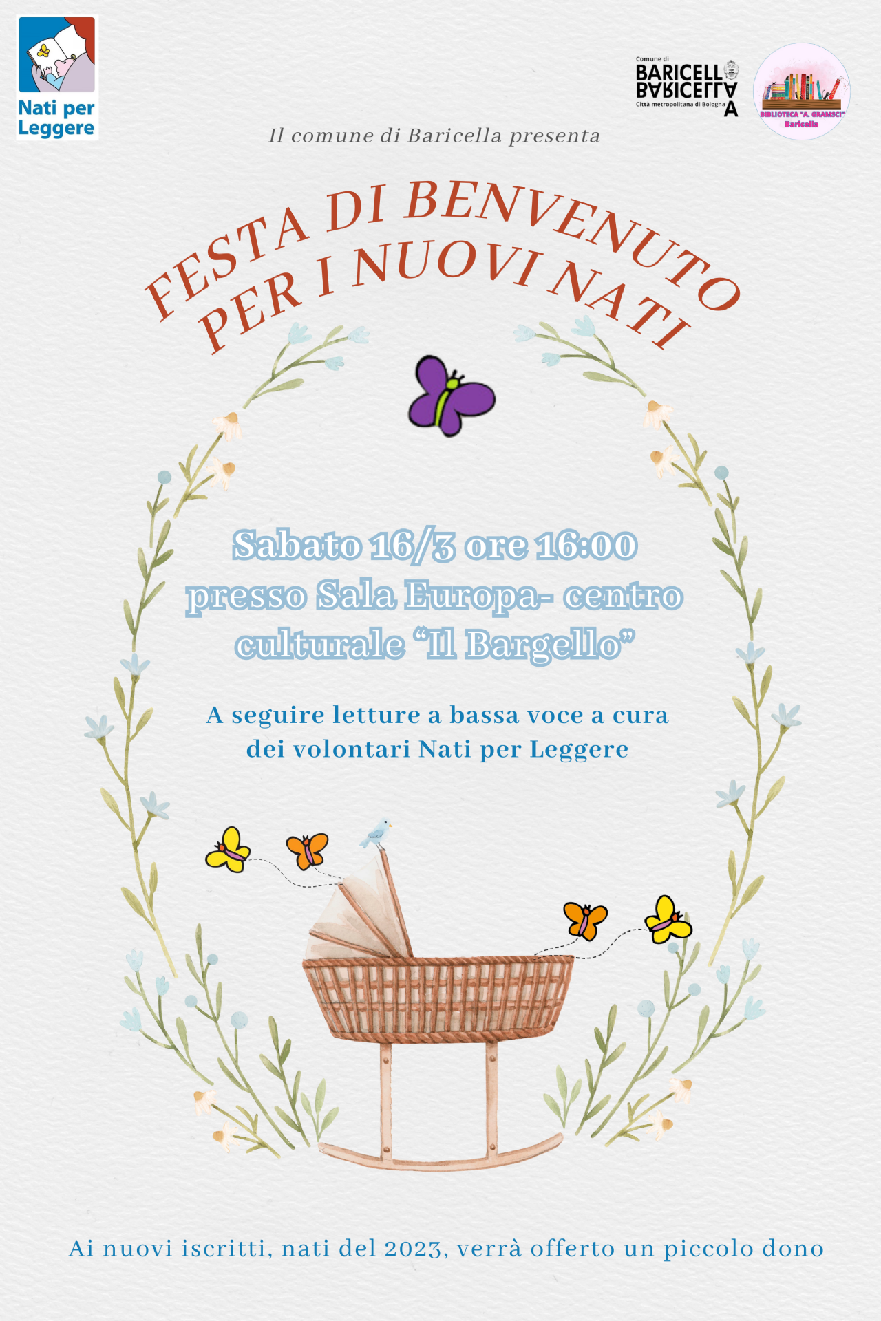 Il Comune di Baricella e la Biblioteca locale si preparano ad accogliere con entusiasmo i nuovi nati del 2023 con una festa dedicata alla promozione della lettura in famiglia. L'evento si terrà sabato 16 marzo ore 16:00 presso la Biblioteca di Baricella, situata in Via Europa, 3. L'iniziativa si propone di promuovere la lettura in famiglia fin dai primi mesi di vita.