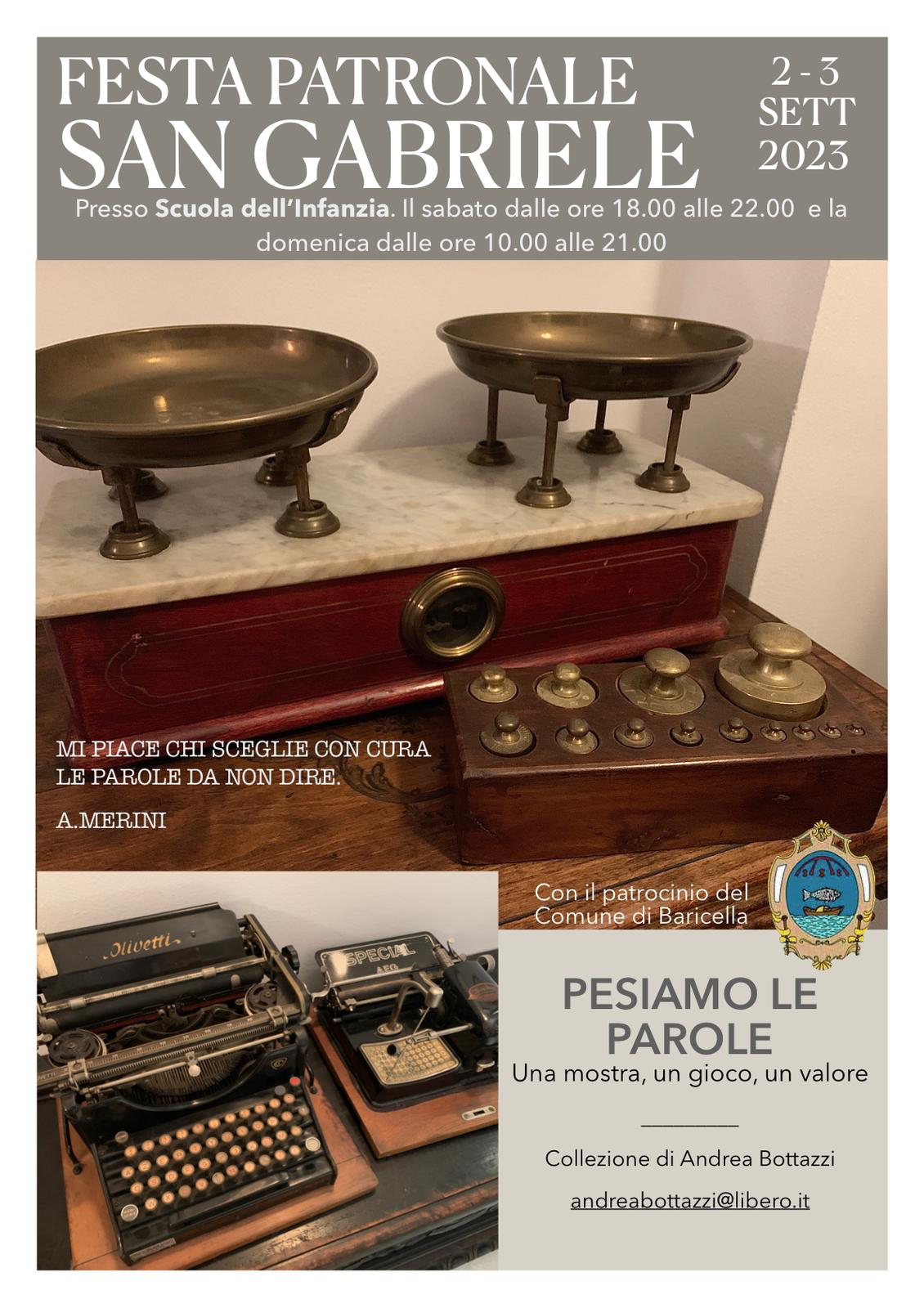Per l’occasione sarà allestita nelle giornate del 2 e 3 settembre la mostra “Pesiamo le Parole” presso la Scuola dell’Infanzia, un momento di riflessione sull’importanza delle parole tra gli oggetti di un passato che ci appartiene, potendo ammirare l’ingegno dietro ognuno di essi.