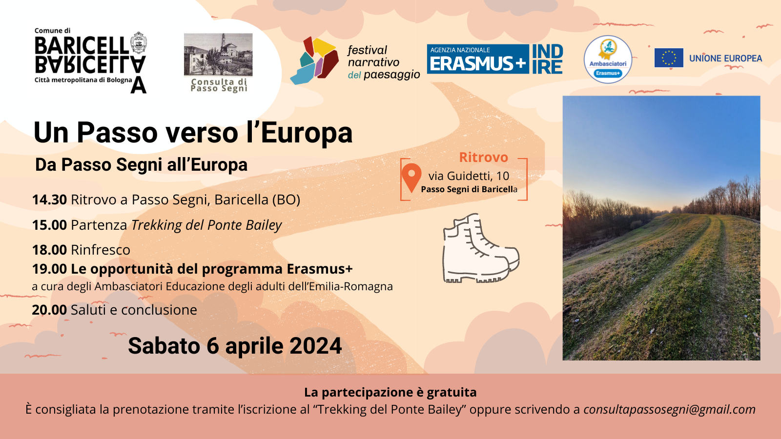 Al termine della camminata, alcuni ambasciatori Erasmus+ EDA dell'Emilia Romagna presenteranno le opportunità del Programma Erasmus+ riservate agli adulti. L'iniziativa della Consulta di Passo Segni, mira a promuovere le opportunità europee anche nelle aree rurali e decentrate, valorizzandone le specificità. In calce la locandina ad hoc! Il trekking diventa in questo caso anche anche un'occasione di netwalking, una pratica che abbina l'attività fisica all'aria aperta e l'opportunità di formazione e dialogo.