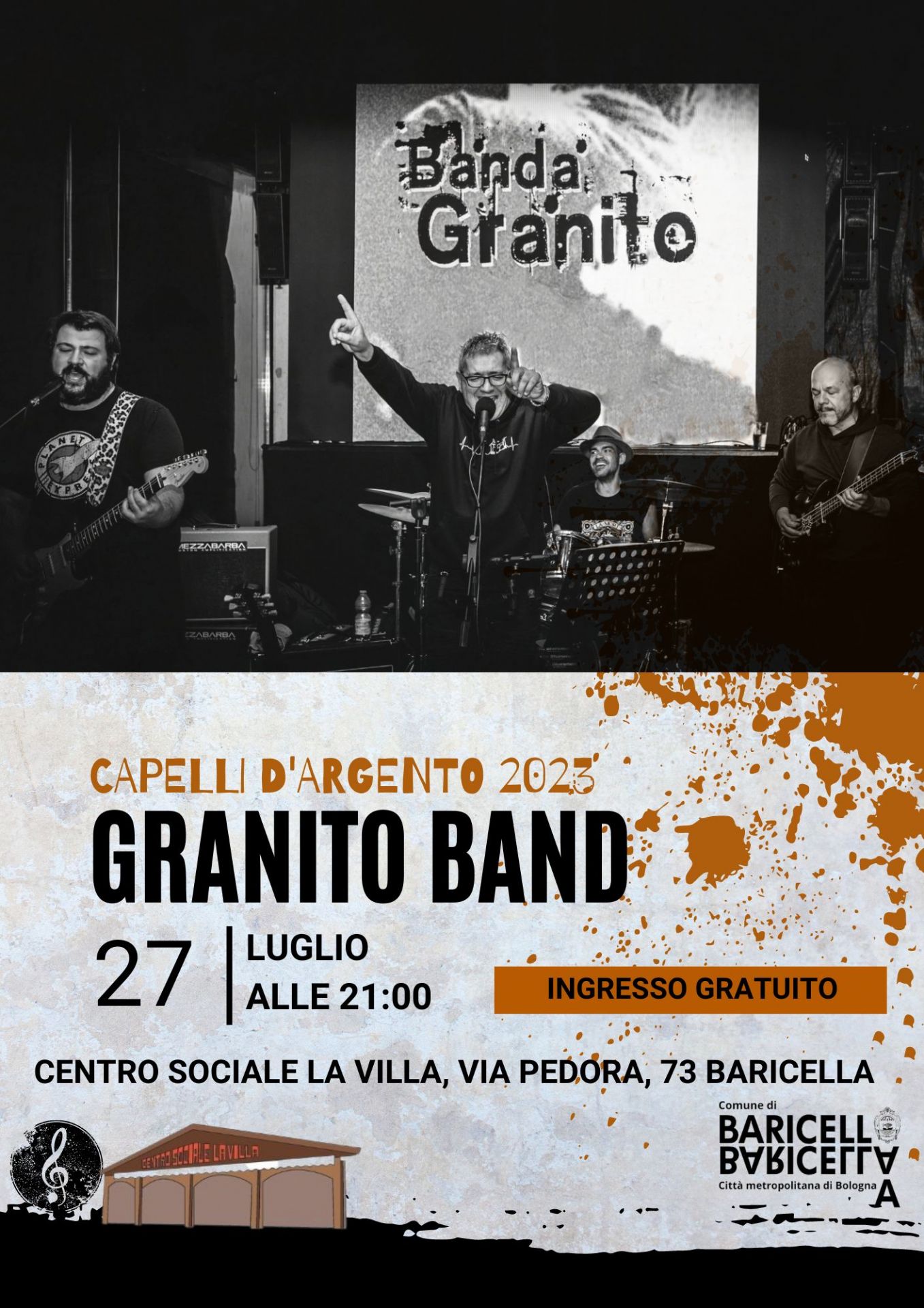 Nell'ambito della 25° edizione della Rassegna musicale "Capelli d'Argento" Giovedì 27 Luglio alle ore 21.00 vi aspettiamo presso il Centro Sociale “La Villa” in via Pedora 73, dove si terrà il concerto della Granito Band per una serata all’insegna del Rock!