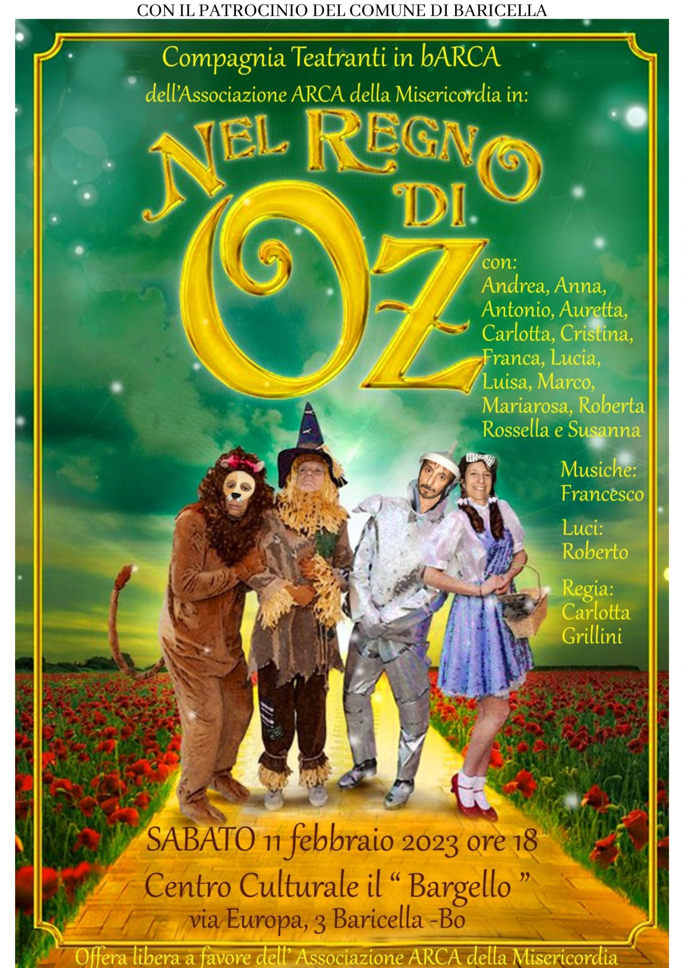 Sabato 11 Febbraio 2023 alle ore 18:00 in Sala Europa presso il Centro Culturale il Bargello, la Compagnia Teatrale Teatranti in bARCA presenta lo spettacolo teatrale NEL REGNO DI OZ, una rivisitazione della fiaba per bambini e adulti ispirata al romanzo Il mago di Oz di Frank Baum.