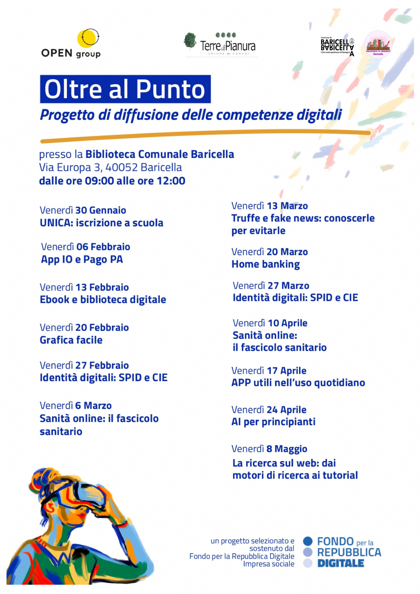 Il 30 gennaio 2026 parte “Oltre al punto”, un’iniziativa promossa da Terre di Pianura in collaborazione con il Comune di Baricella e Biblioteca "A. Gramsci" pensata per aiutare tutti i cittadini a sviluppare le proprie competenze digitali attraverso micro-corsi brevi, semplici e accessibili a chiunque.