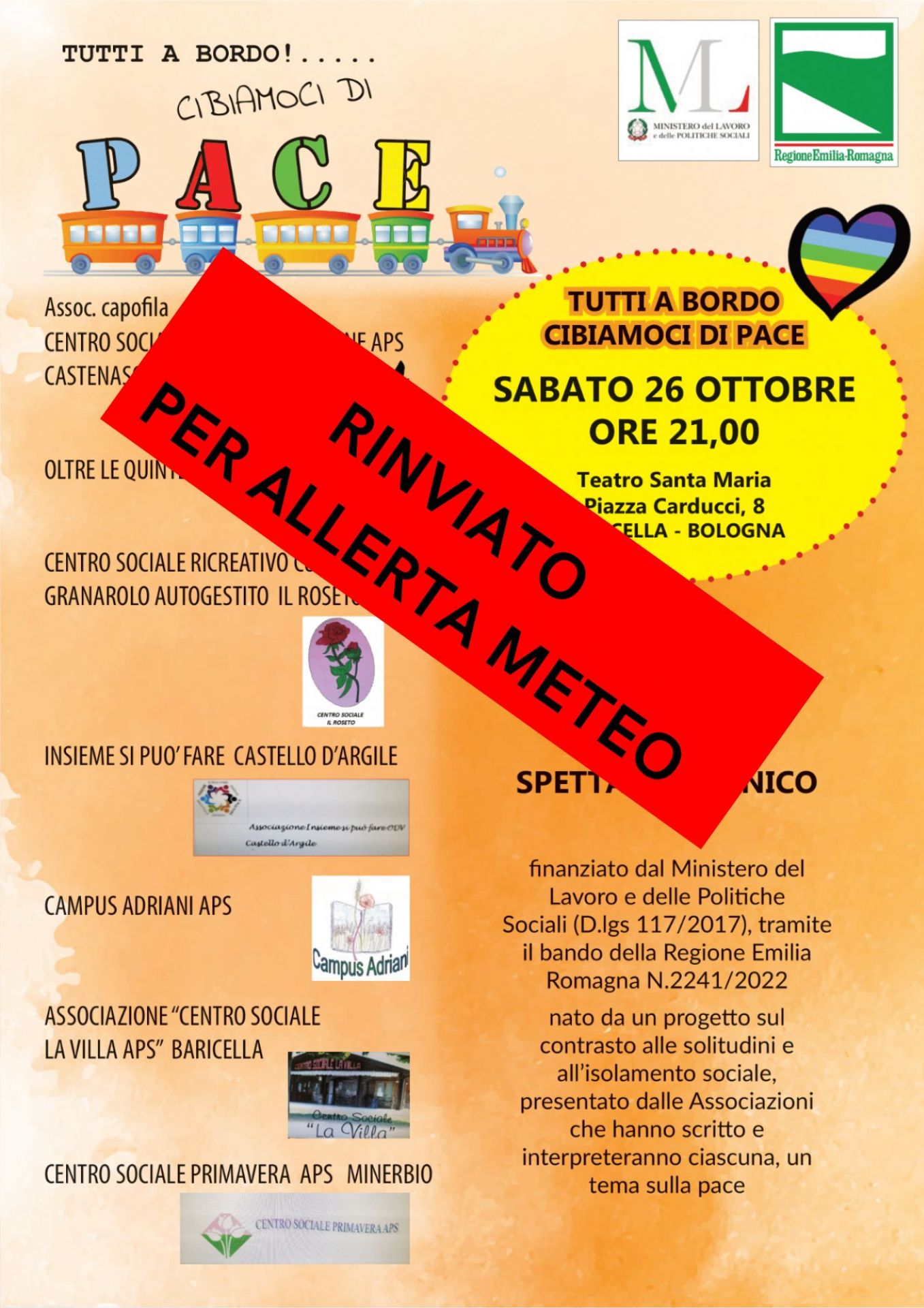 Si informa la cittadinanza che, vista l'allerta meteo in corso, è rinviato a data da destinarsi lo spettacolo teatrale "Tutti a bordo! Cibiamoci di pace" previsto per domani Sabato 26 ottobre 2024 alle ore 21.00 al Teatro Santa Maria, in Piazza Carducci n.8 a Baricella.