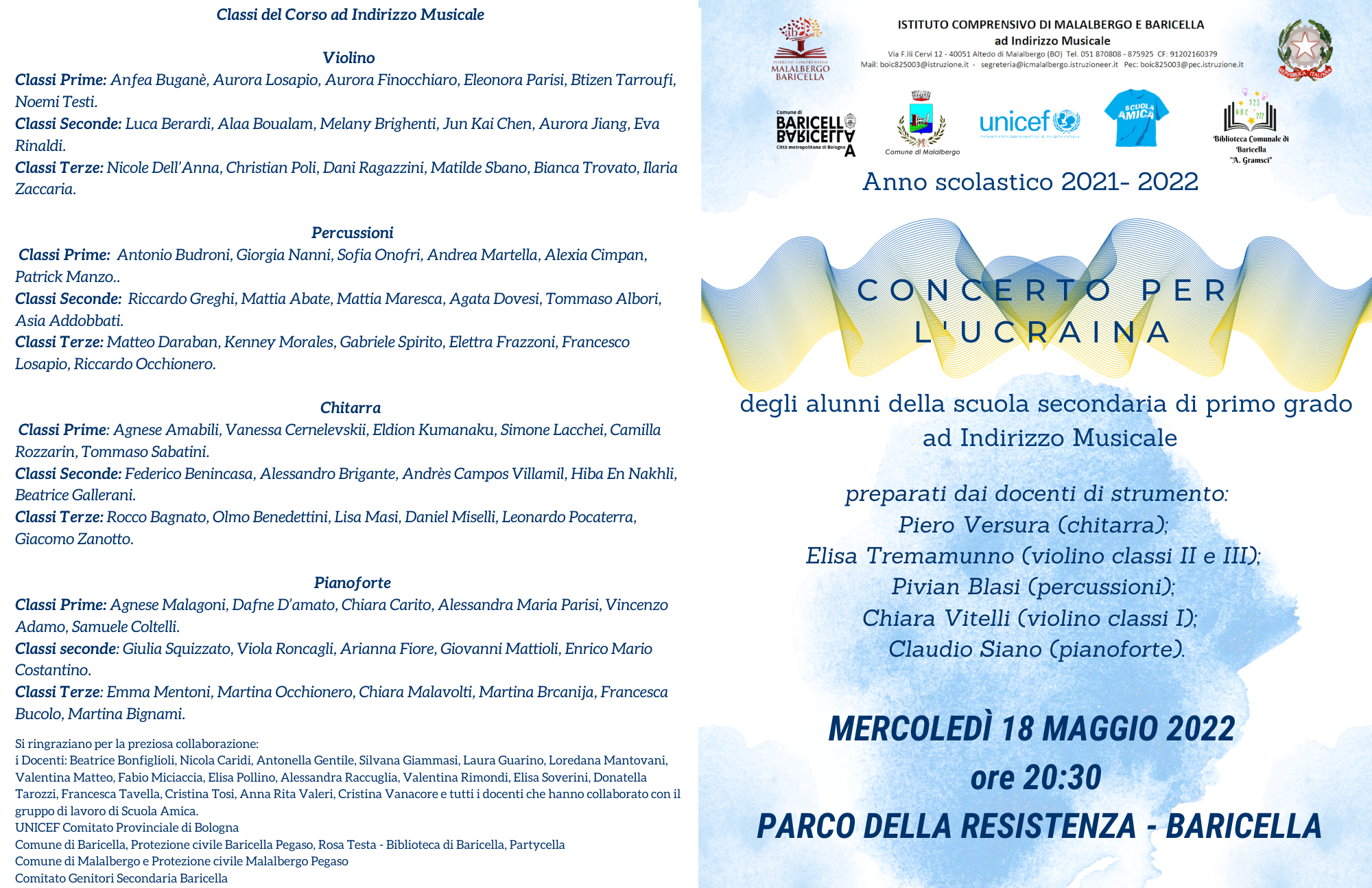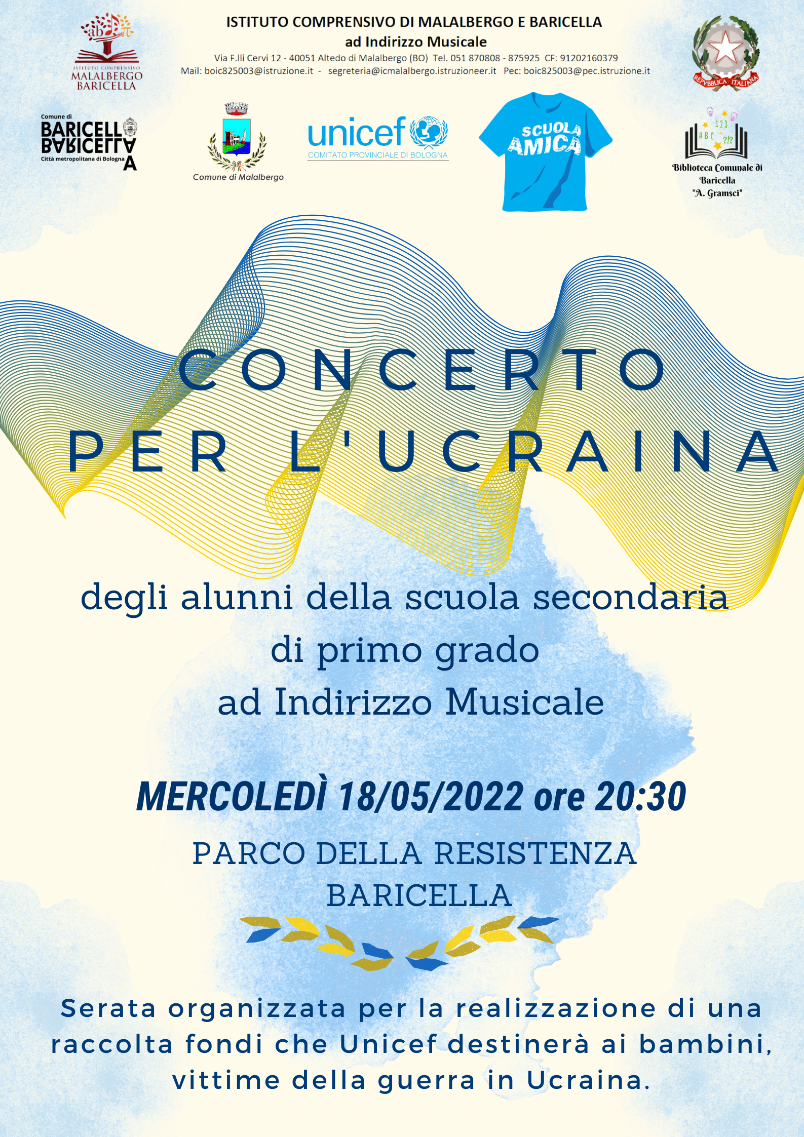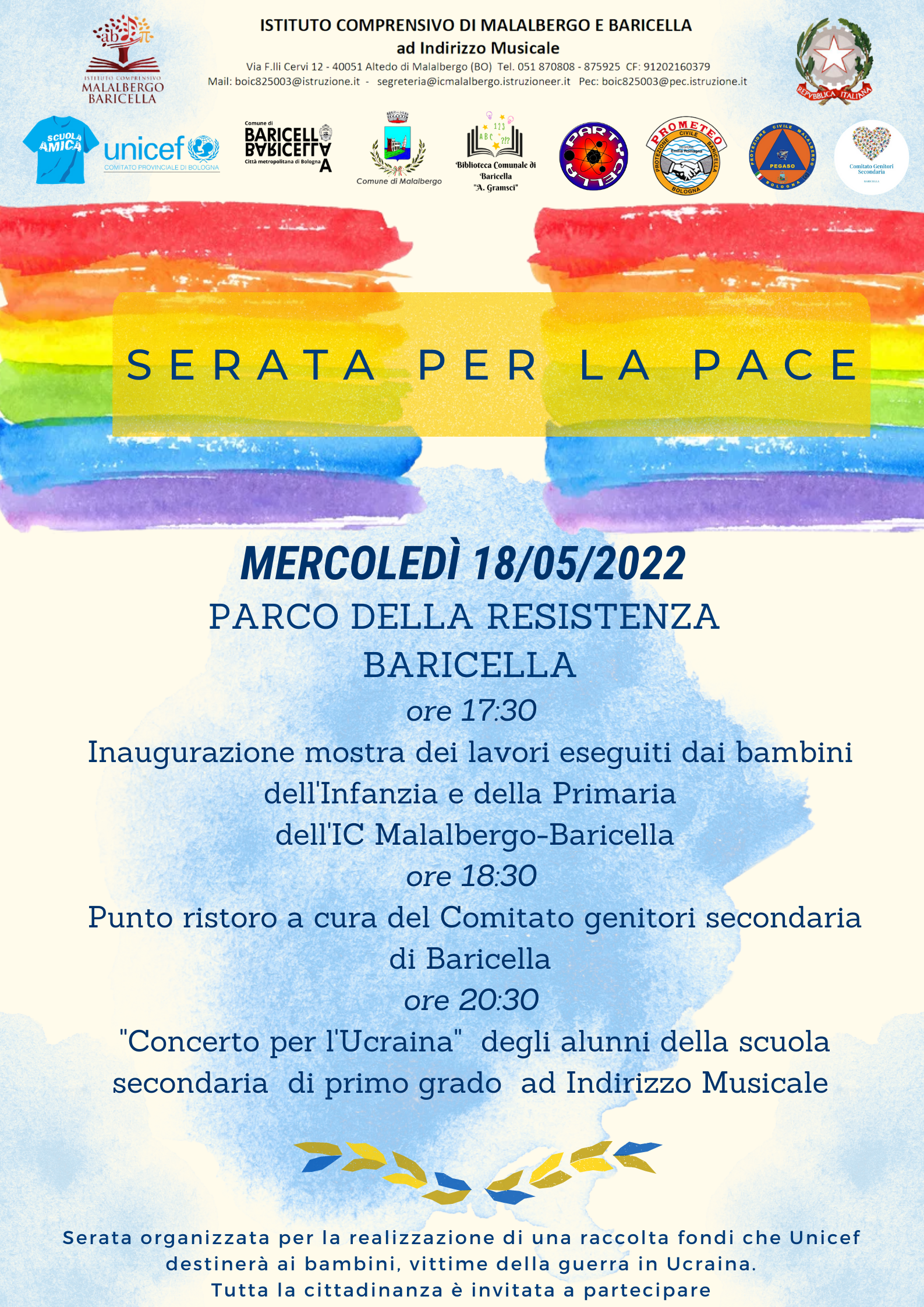 Il 18 maggio dalle ore 17:30 l'Unicef in collaborazione con l'Istituto comprensivo Malalbergo-Baricella, il Comune di Baricella e il Comune di Malalbergo organizzerà, nel parco della Resistenza, in Via Europa 1, a Baricella, la "Serata per la pace".