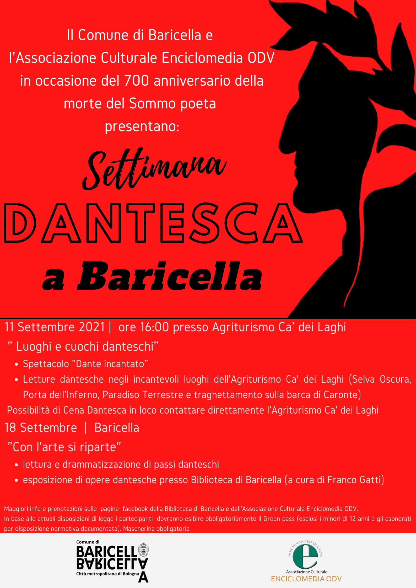 In occasione del 700° anniversario della morte di Dante Alighieri non perderti la "Settimana Dantesca a Baricella" organizzata dal Comune di Baricella in collaborazione con l'Associazione Culturale Enciclomedia ODV l'11 e il 18 settembre sarete traghettati nei luoghi decantati dal Sommo nella celeberrima Divina Commedia.
