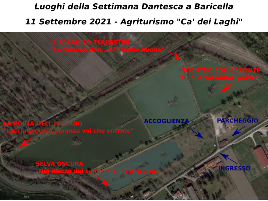 I partecipanti saranno accompagnati dal capo contrada lungo sentieri per circa 15' di piacevole passeggiata in luoghi che evocheranno le atmosfere della Commedia. Incontrerete il terribile Caronte che vi traghetterà sulle sponde dell'Acheronte; attraversando tutta la Selva Oscura raggiungerete la temibile Porta dell'Inferno; se avrete il coraggio di continuare il viaggio vi aspetterà la dolcezza infinita e la beatitudine del Paradiso Terrestre.