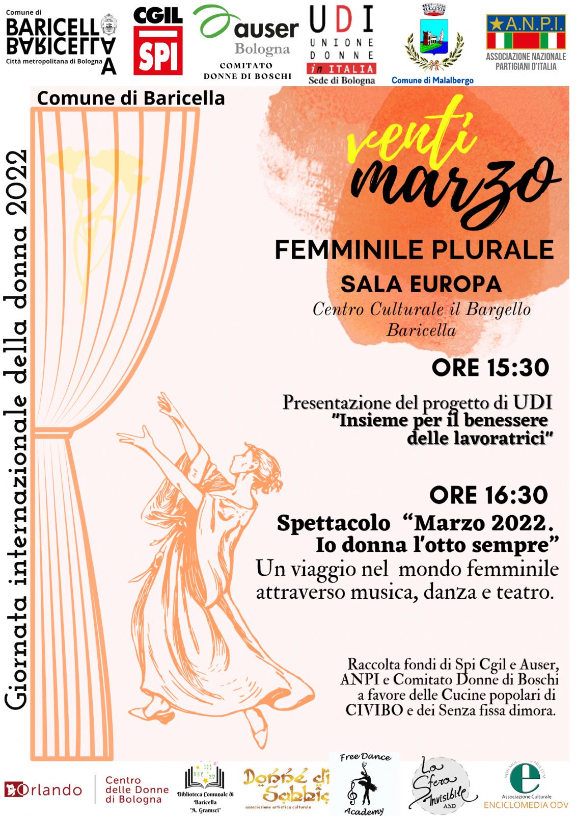 Nell'ambito della rassegna Otto Marzo: Femminile plurale dedicata alla Giornata Internazionale della Donna, Domenica 20 Marzo 2022 presso il Centro culturale Il Bargello, in sala Europa, alle ore 16.30 si svolgerà uno spettacolo che si propone di trasportare il pubblico in un viaggio immaginario al femminile attraverso varie forme di arte. Musica, danza, teatro faranno da filo conduttore nel raccontare storie, avventure, sogni di donne di ieri e di oggi.