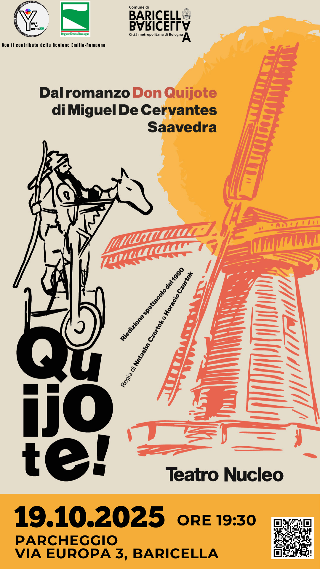 Con Quijote!, la compagnia storica Teatro Nucleo firma una grande creazione teatrale all’aperto, visionaria e potente: un affresco popolare e universale, ispirato al capolavoro di Cervantes, dove ogni spettatore è chiamato a sognare, a lottare, a sbagliare… e a credere.