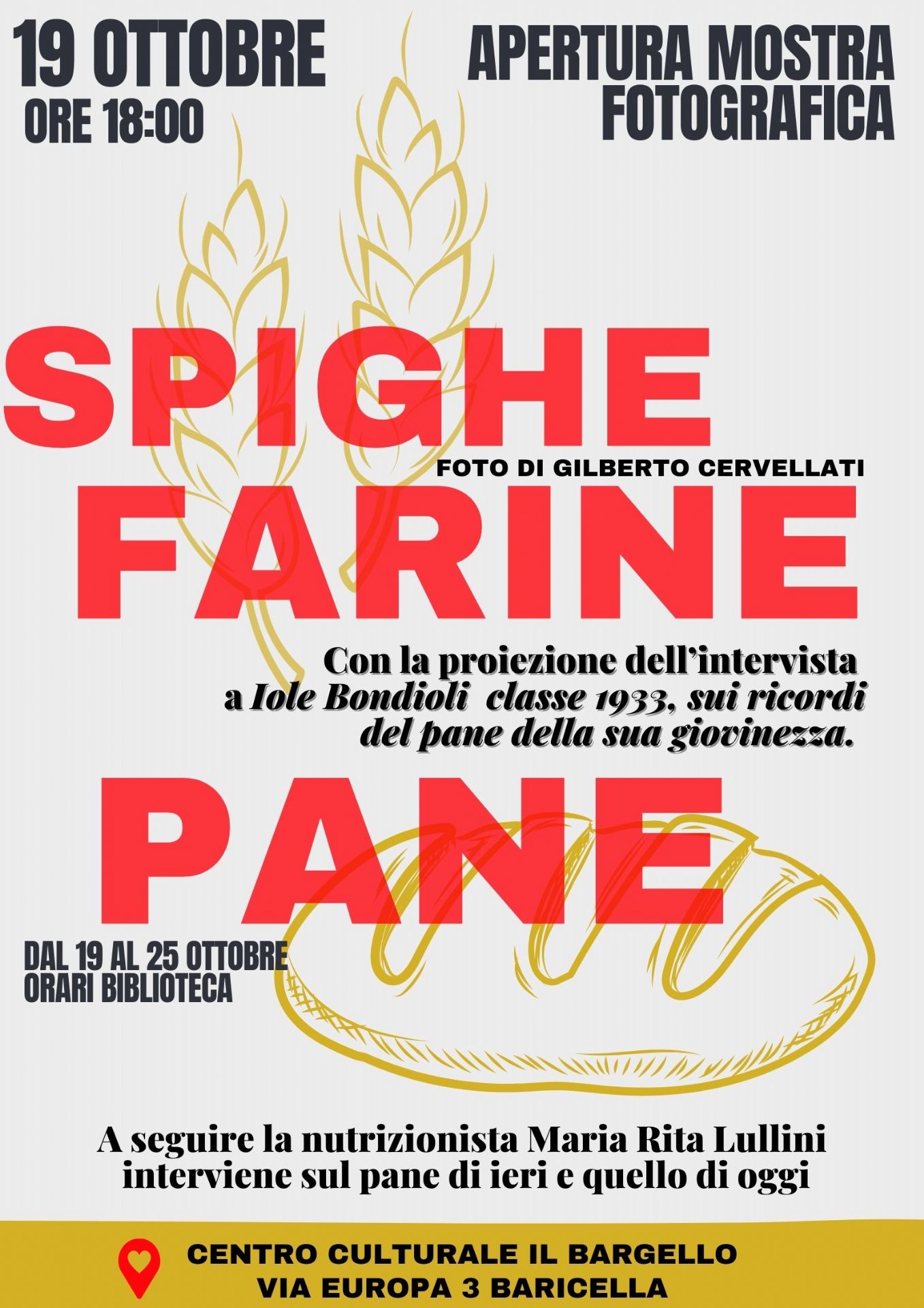 Alle ore 18:00 si aprirà la mostra fotografica Spighe, Farine e Grano dedicata alla battitura del grano, un'antica pratica agricola che scandiva i ritmi della vita contadina. Le foto di Gilberto Cervellati ci riportano alla prima metà del Novecento, quando trasformare il frumento in farina non era solo un lavoro, ma un vero e proprio rito comunitario. Accanto alle immagini dedicate al passato, ci saranno scatti dedicati al pane marocchino fatto in casa e al panificio locale. Uno spunto di riflessione su come il pane, nelle sue diverse varianti, unisce culture e generazioni. Verrà proiettata inoltre, un' intervista inedita di Gilberto Cervellati a Iole Bondioli, classe 1933, sui ricordi del pane della sua giovinezza.