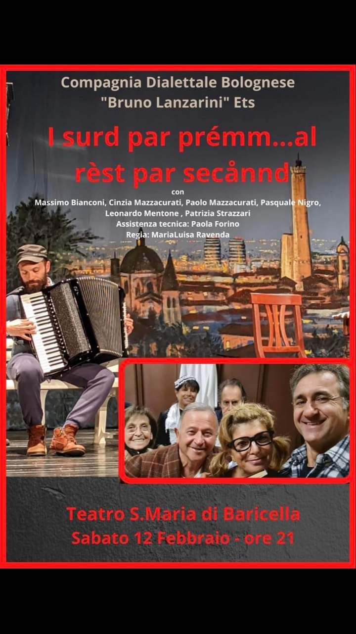 Sabato 12 Febbraio alle ore 21:00 c/o il Teatro Santa Maria di Baricella:  "I Surd prémm... al rèst par secannd" della Compagnia Dialettale Bolognese “BRUNO LANZARINI” Ets