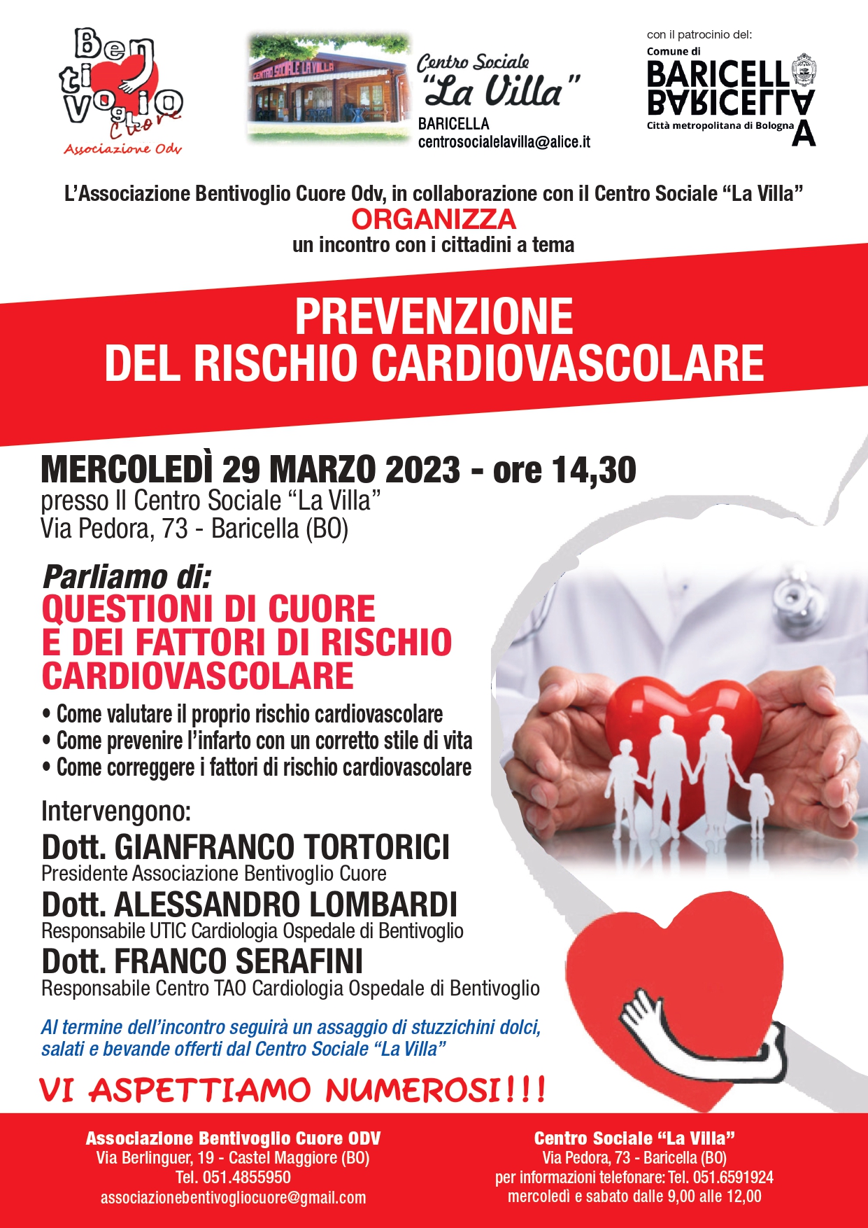 Mercoledì 29 Marzo 2023 alle ore 14:30 presso il Centro Sociale “La Villa” sito in via Pedora, 73 - Baricella (BO) si terrà un incontro sulla PREVENZIONE DEL RISCHIO CARDIOVASCOLARE, a cura dell'Associazione Bentivoglio Cuore Odv, nel quale verrà affrontato:
