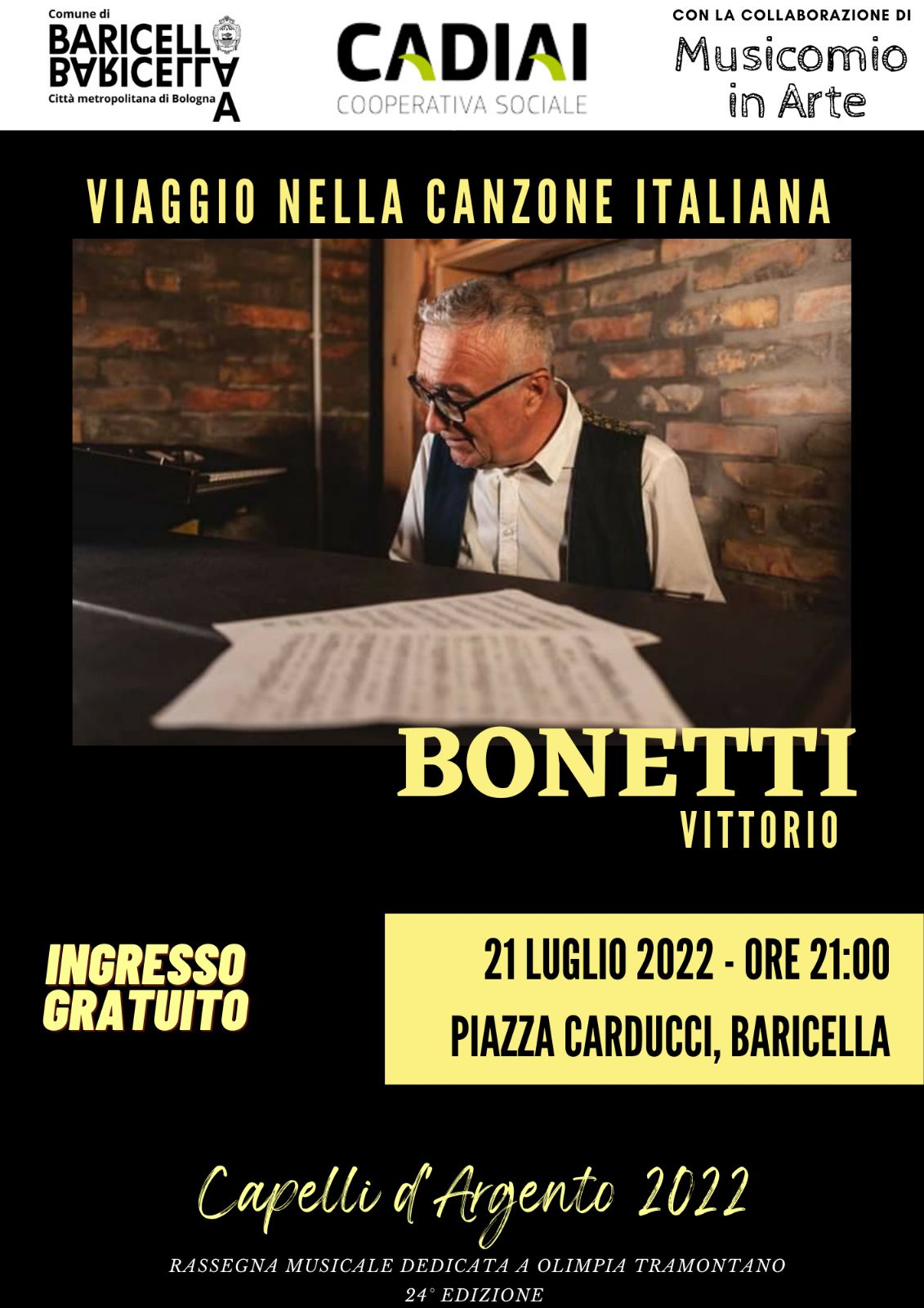 Nell'ambito della 24° edizione della Rassegna Musicale Capelli d'Argento in Piazza Carducci a Baricella si esibirà alle 21:00 il cantautore Vittorio Bonetti.
