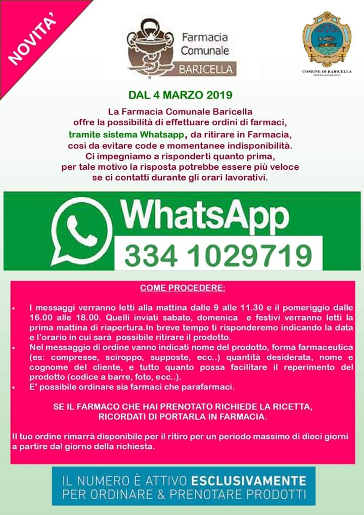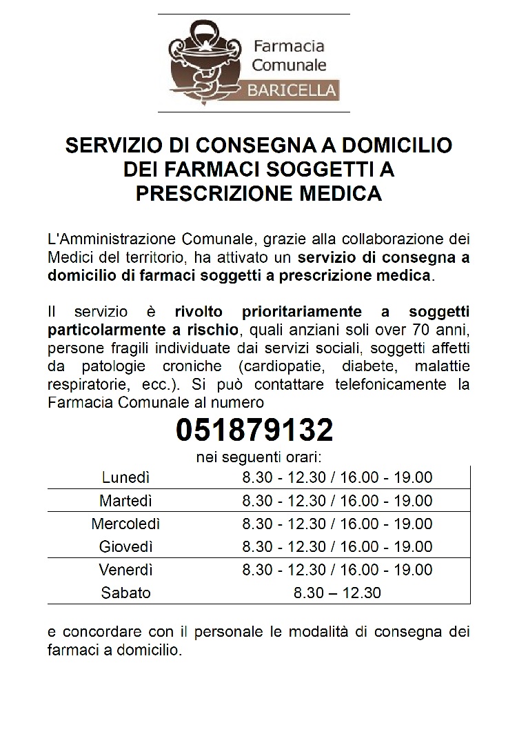 | Servizi | La farmacia consente di prenotare comodamente via WhatsApp (vedi volantino) Grazie alla collaborazione dei Medici del territorio, è attivo un servizio di consegna a domicilio di farmaci soggetti a prescrizione medica. Il servizio è rivolto prioritariamente a soggetti particolarmente a rischio, quali anziani soli over 70 anni, persone fragili individuate dai servizi sociali, soggetti affetti da patologie croniche (cardiopatie, diabete, malattie respiratorie ecc). Per prenotare telefonare al 051 879132 negli orari di apertura della Farmacia (vedi volantino) |